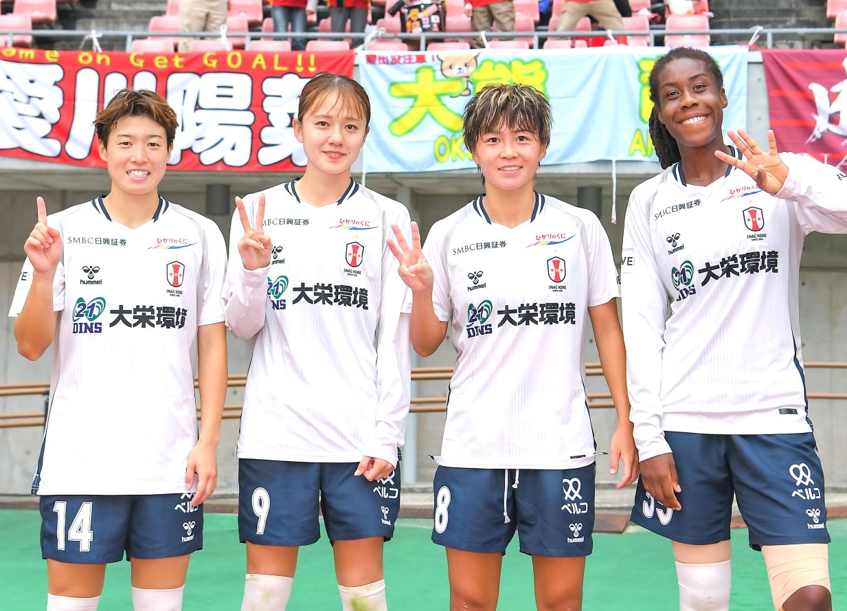 指で得点順を示す INAC神戸(左から)14水野蕗奈、9吉田莉胡、8山本摩也、55ヴィアン・サンプソン /(C) WE LEAGUE