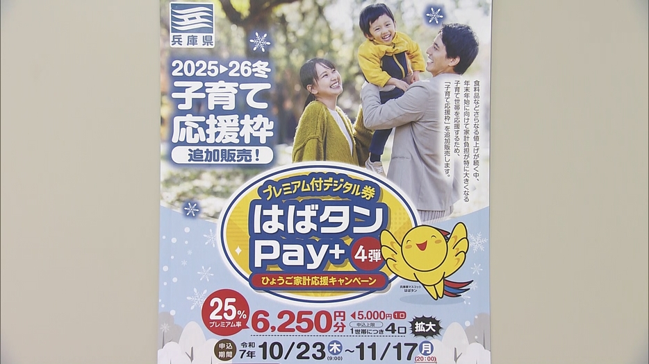 兵庫県はプレミアム付き商品券「はばタンPayプラス」の子育て応援枠の申込みを、10月23日の午前9時から開始。