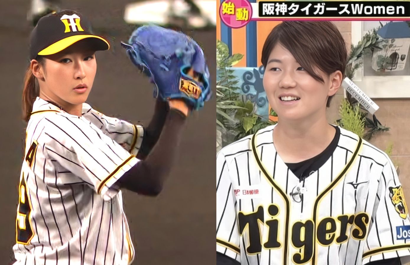 阪神タイガースWomen (左)19植村美奈子(甲子園球場)、(右)16水流麻夏(サンテレビ スタジオ)