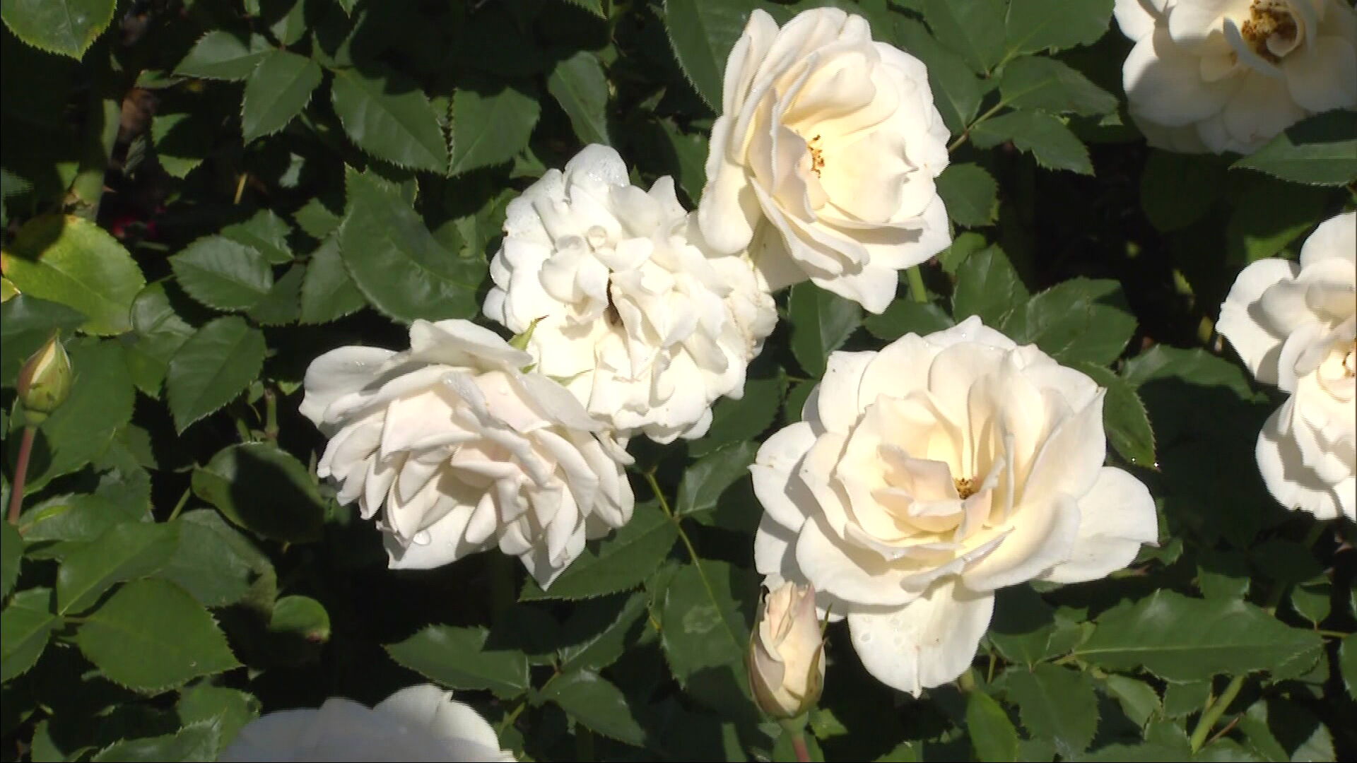 園内は、最も多く咲く、白色の「エーデルワイス」をはじめ気品あふれるバラで彩られ訪れた人たちは、散策したり写真を撮ったりしながら秋の訪れを感じていました。