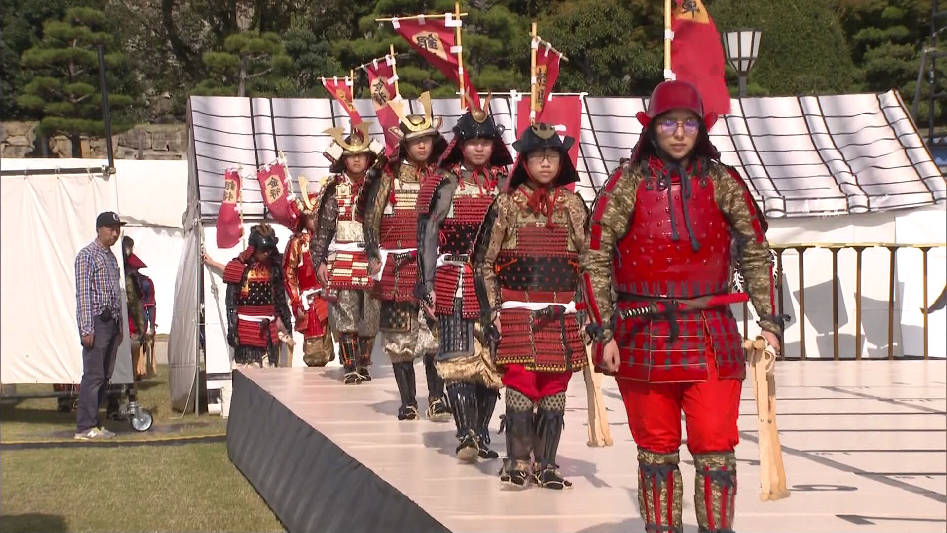 姫路城三の丸広場には、20メートル四方の巨大な将棋盤に、甲冑を身にまとった人の駒が並びます。
