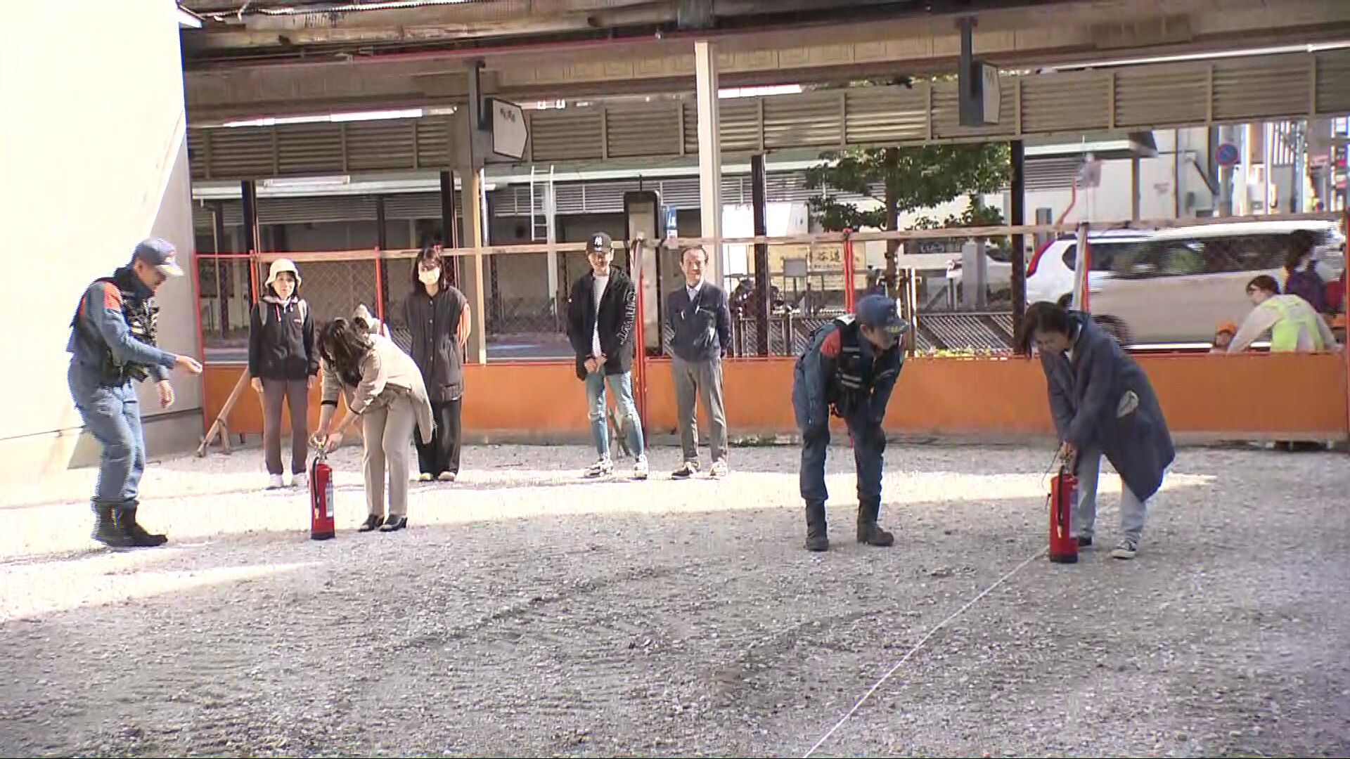 従業員らは、逃げる手順や通報の方法などを消防士と一緒に確認していました。