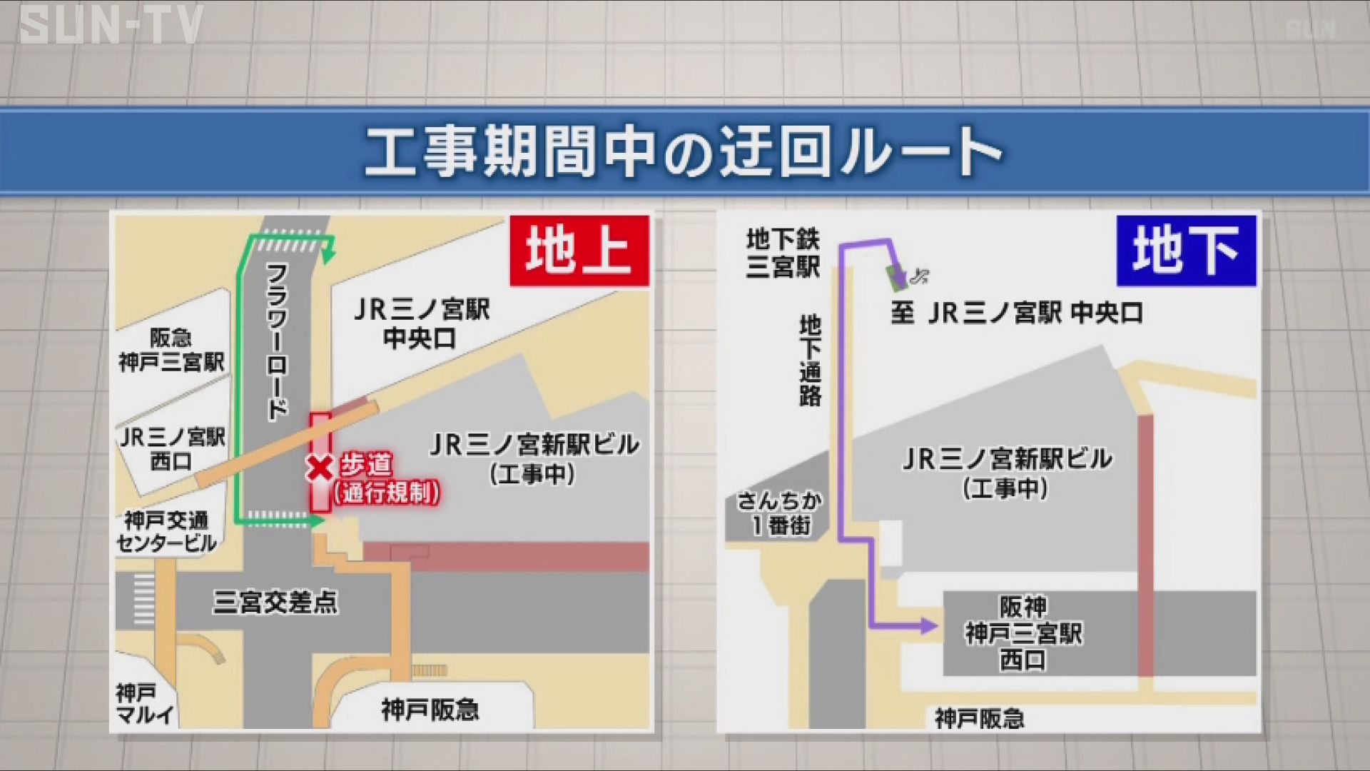 これに伴い、三宮交差点からJR三ノ宮駅方面への移動は横断歩道を渡り、フラワーロードを通る迂回の他、地下通路の活用や階段などで地上に出ることなどが必要です。