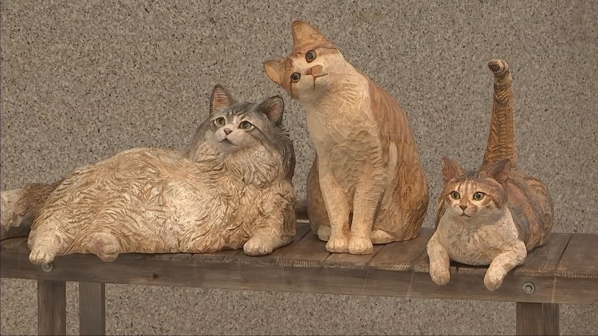 クスノキを使ったほぼ原寸大の動物や、身近に暮らす犬や猫、旅先で出会った動物など、一匹一匹の個性が丁寧に表現されています。