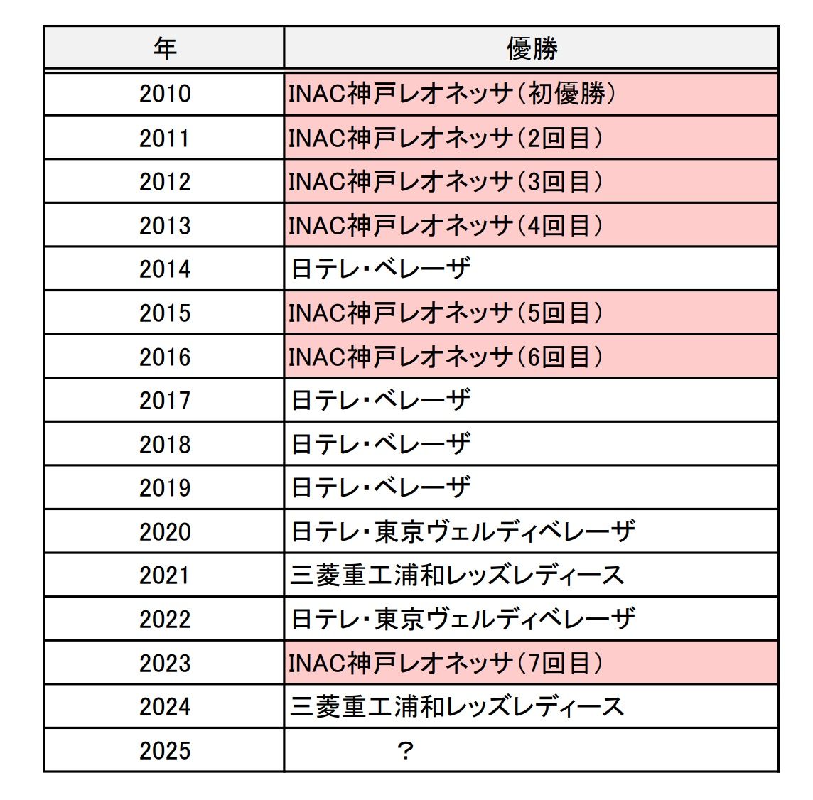 このうちINAC神戸は、2010年の初優勝から4連覇し、15・16年にも連覇。