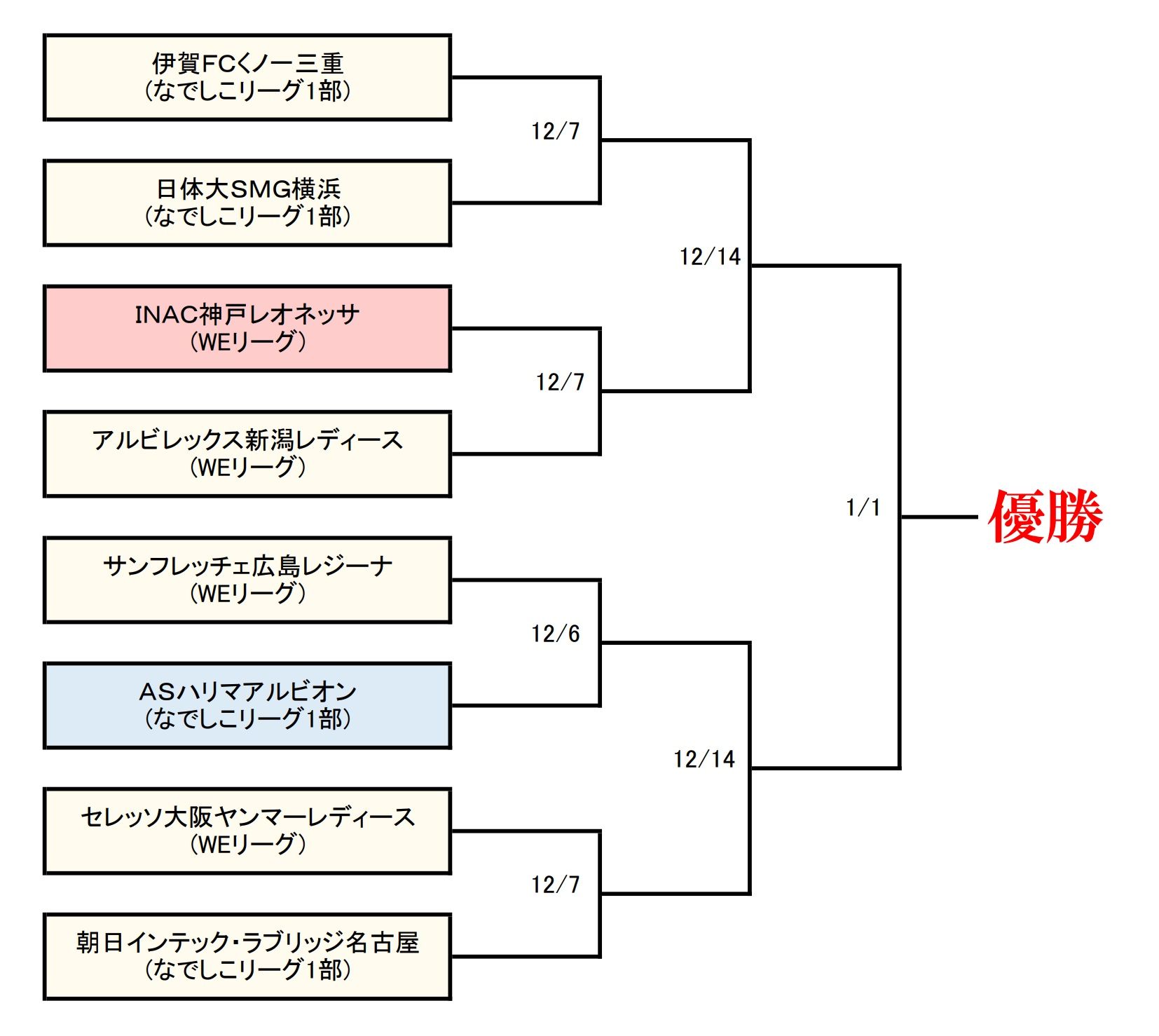 ベスト8には、WEリーグのINAC神戸レオネッサと、なでしこリーグ1部のASハリマアルビオン(所在地:姫路市)の兵庫県2チームが進出した。