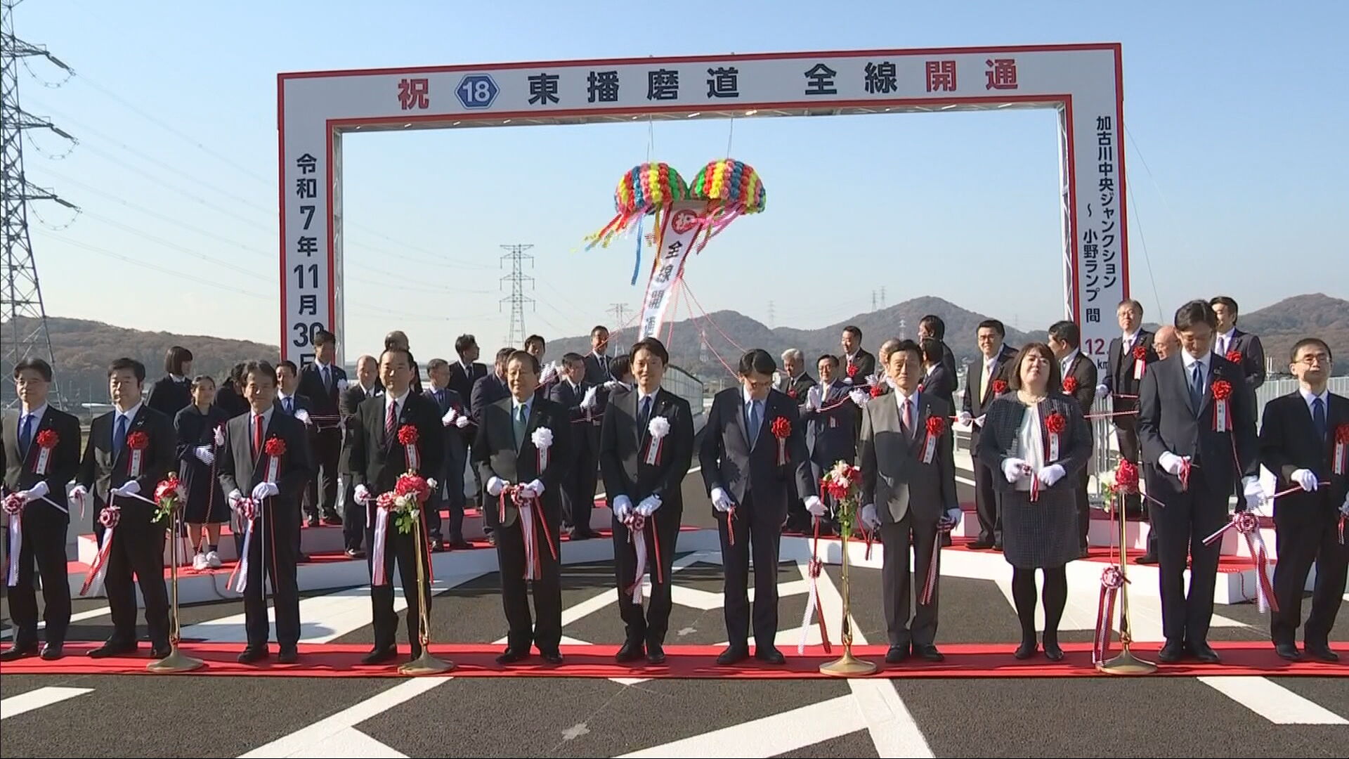 小野ランプ付近で開かれたセレモニーには、兵庫県の斎藤知事や近隣の市長らが集まり、県道加古川小野線「東播磨道」の全線開通を祝いました。