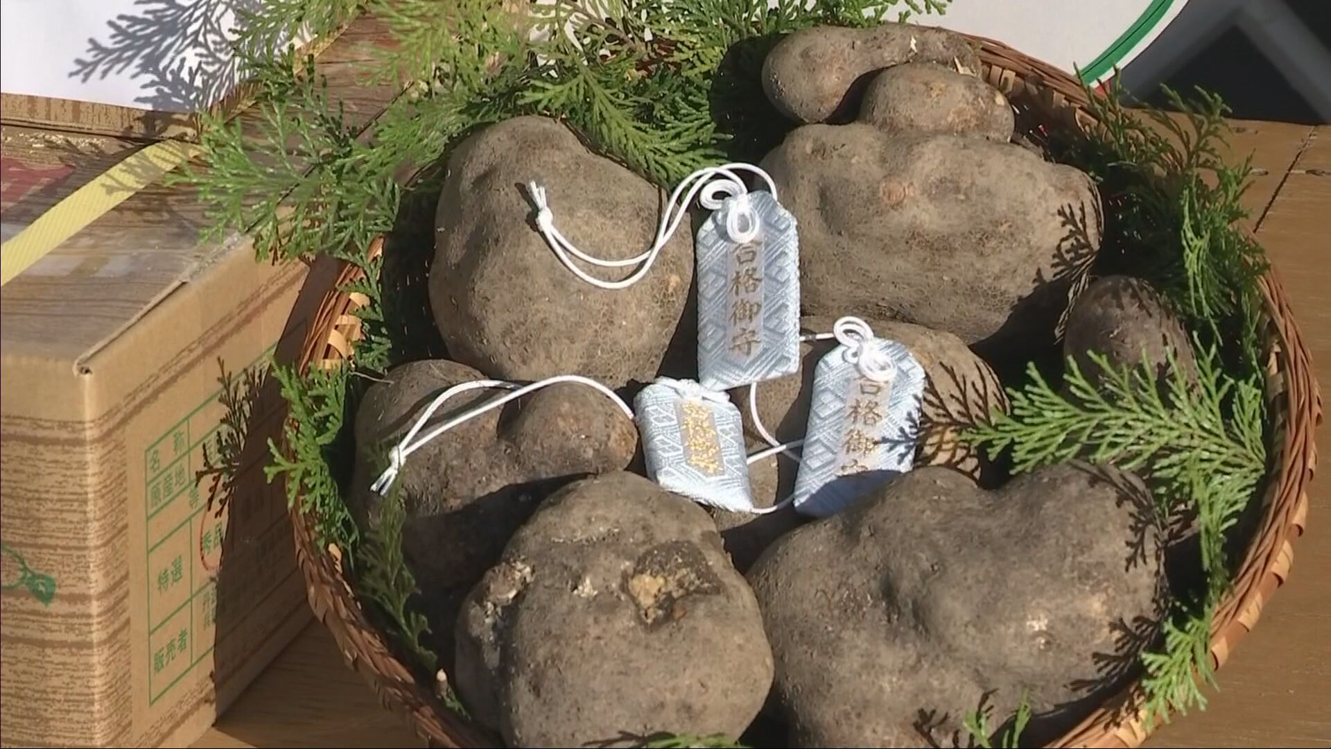 丹波篠山市の「特産館ささやま」では、受験を控えた子どもたちに粘り強く合格を掴んでほしいと、毎年この時期に学業のお守りを付けた「山の芋」を販売しています。