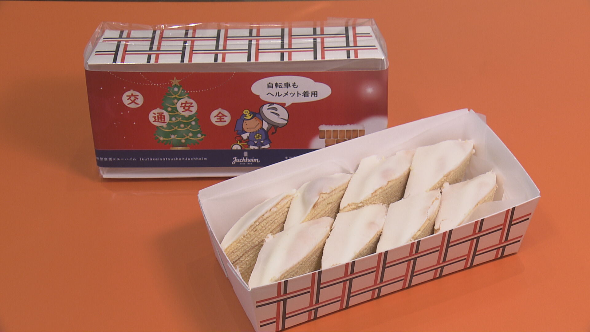 この取り組みは、生田署と「ユーハイム」が共同で取り組んでいるもので、人気商品バウムクーヘンのパッケージには、クリスマスツリーの横に生田署のキャラクター「いくたん」が描かれ、自転車のヘルメット着用を呼び掛けています。