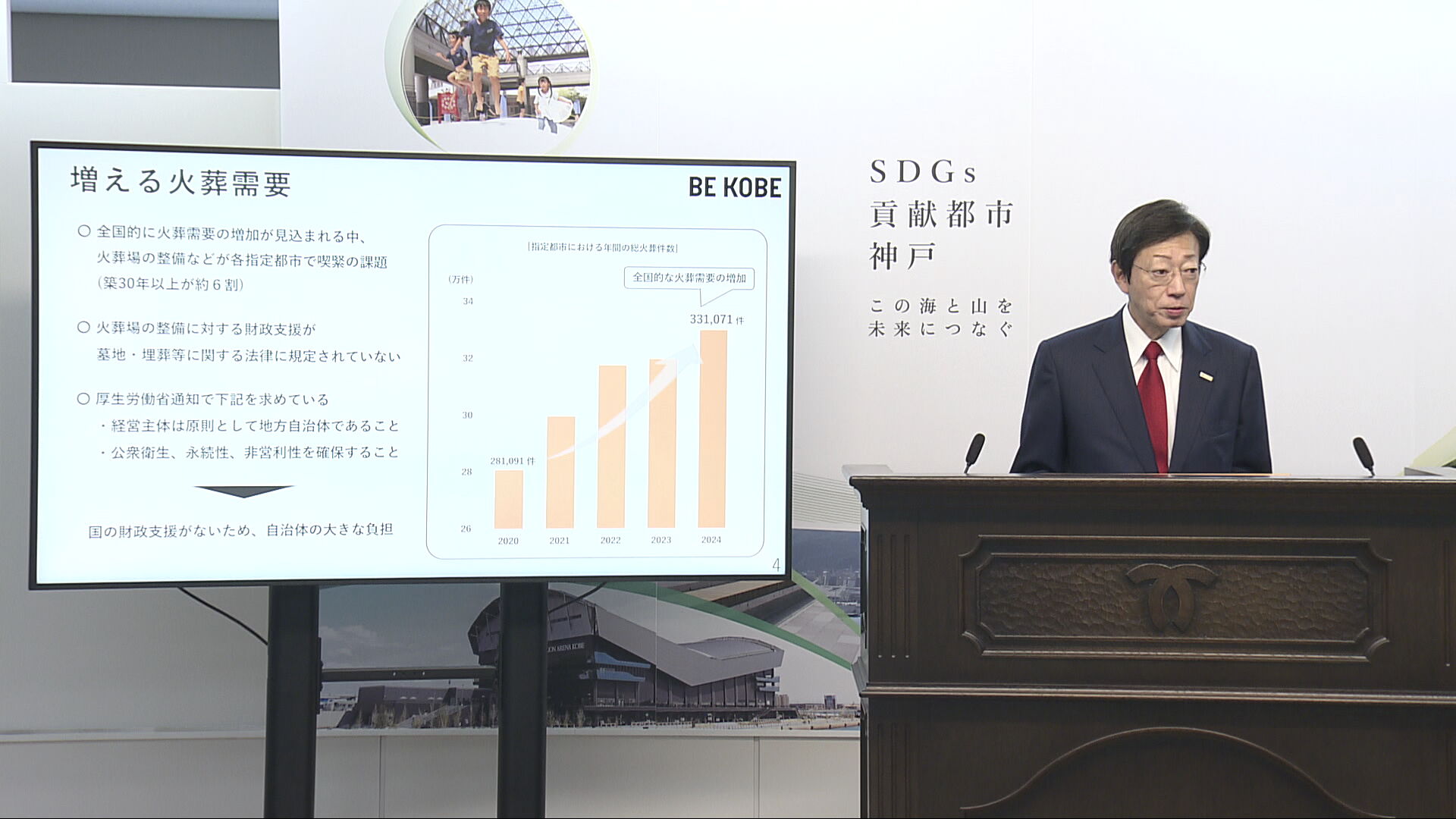 神戸市の久元市長は12月11日の会見で、政令指定都市市長会が、火葬場を整備するにあたり国に財政的な支援を求める要望書を今月中にも提出することを明らかにしました。