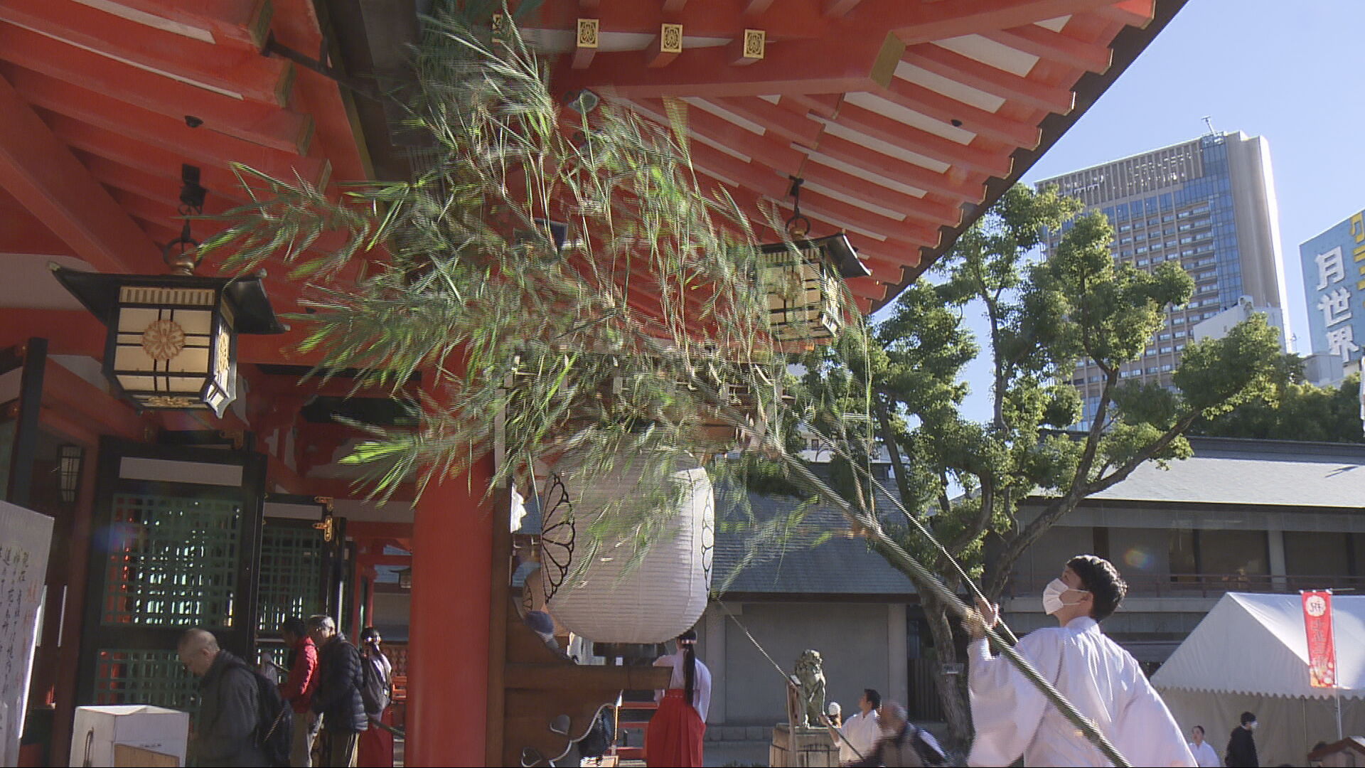新年の準備を始める「事始め」の13日、神戸市中央区の生田神社で恒例の「すす払い」が行われました。