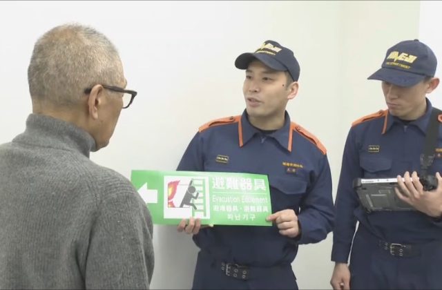 検査では、避難器具や消火設備の確認をした他、外国人にも伝わりやすい新たな避難標識を設置。