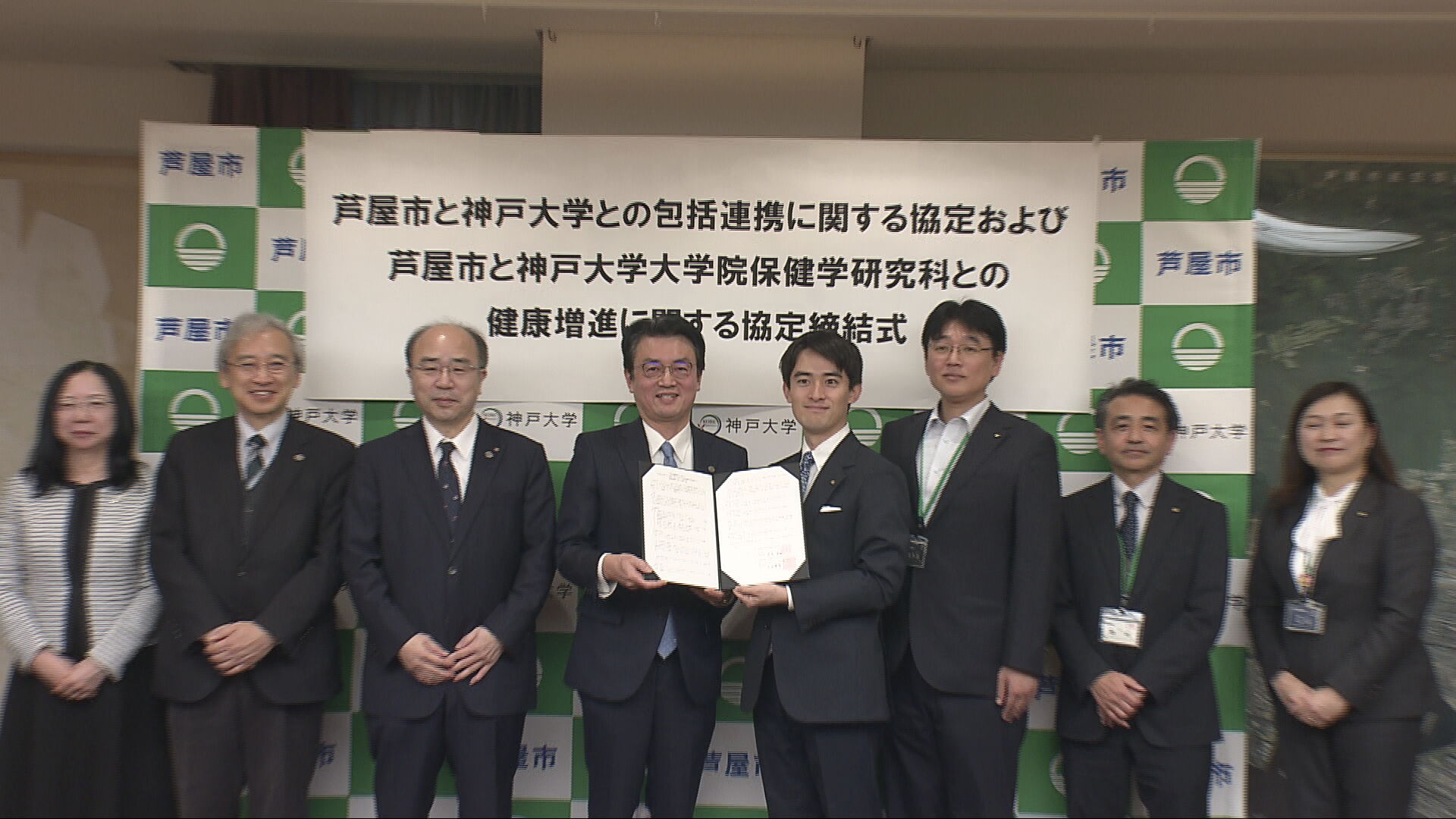芦屋市役所で行われた協定の締結式には高島崚輔市長や神戸大学の藤澤正人学長、神戸大学大学院の石田達郎保健学研究科長らが出席し、協定書にサインしました。