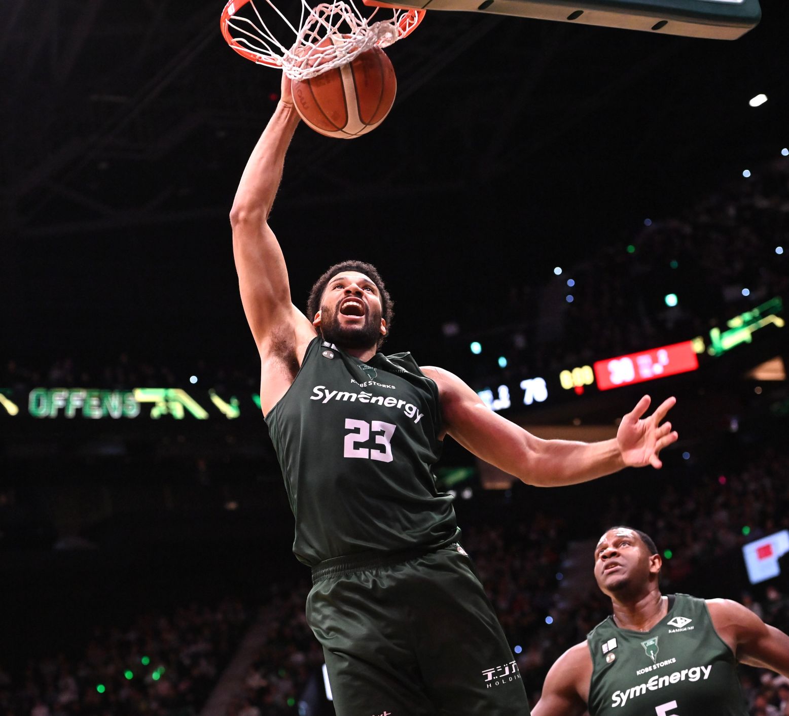 神戸ストークス 23 ヨーリ・チャイルズ、右は 5 アイザック・バッツ (ジーライオンアリーナ神戸)/(c)B.LEAGUE
