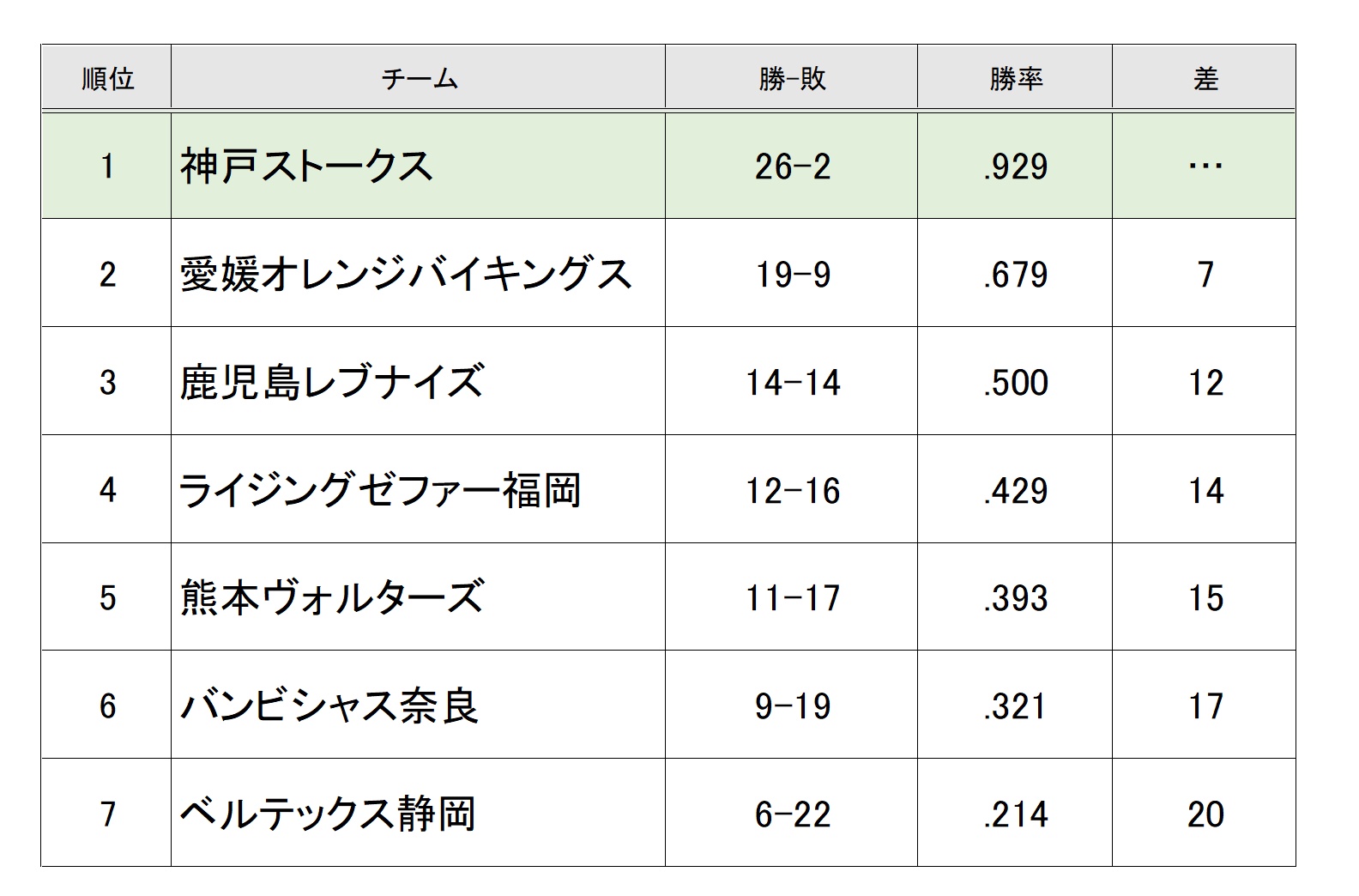 26勝2敗、勝率.929でB2西地区首位をキープしている。