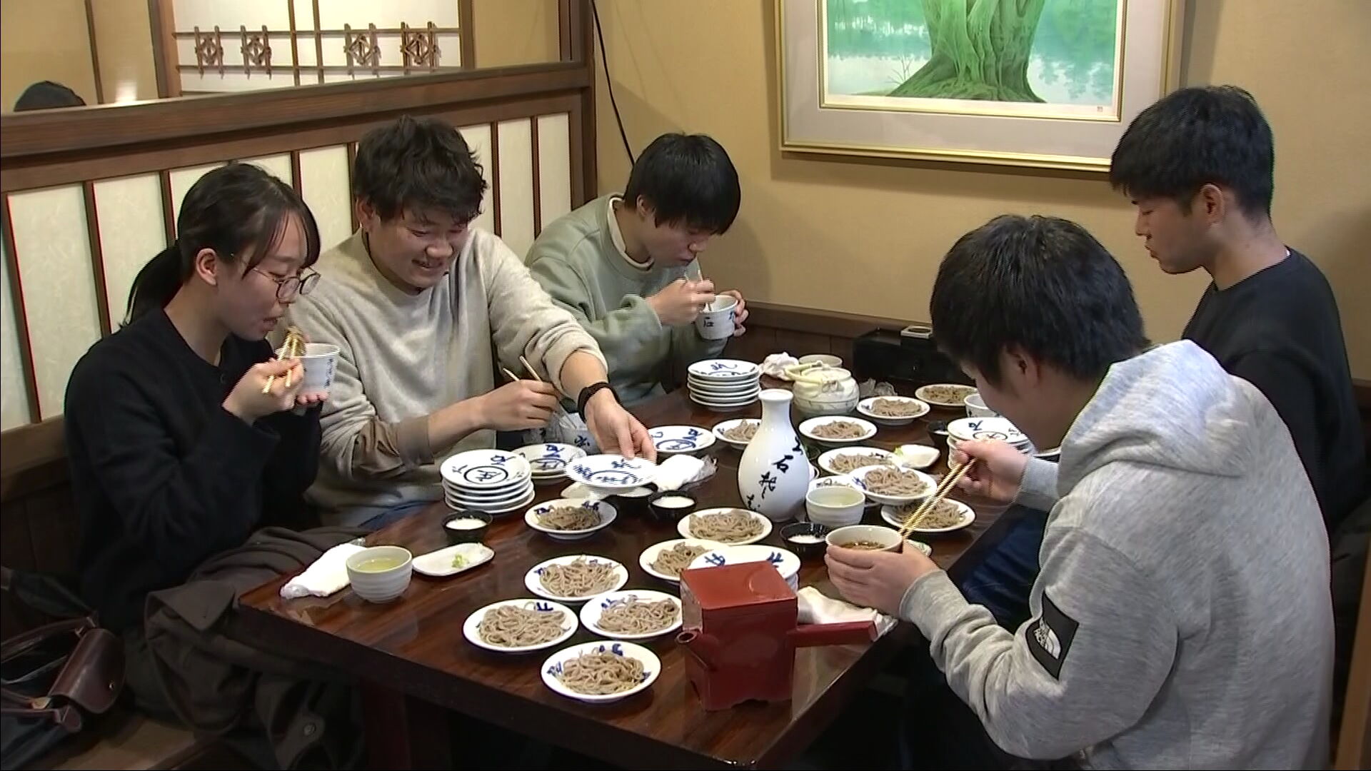 このうち昭和41年創業の「そば庄」でも、京阪神から訪れた観光客や年末に里帰りをした家族連れらがにぎやかにテーブルを囲みつつ、ことし一年を締めくくり、「挽きたて、打ちたて、ゆでたて」の昔ながらの味わいを楽しんでいました。