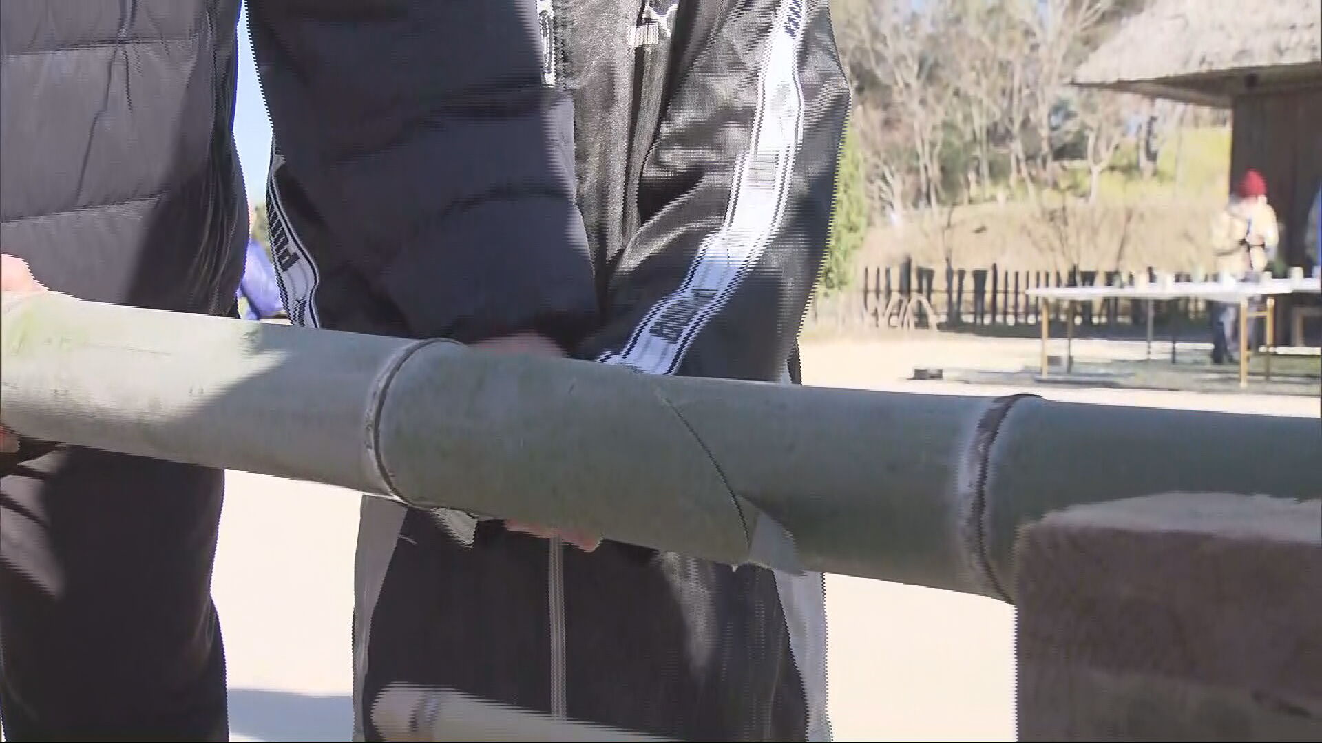 参加者は、園内から切り出された30本の竹をおよそ50センチの長さに切り分けた後、「希望」や「光」などの文字を書き入れていきました。