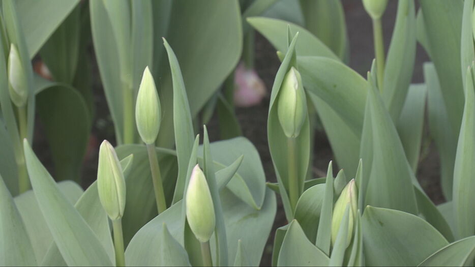 温室の中では、膨らみはじめたつぼみが一足早い春を感じさせていて、約100種類、33万本分のチューリップが順調に育っているということです。