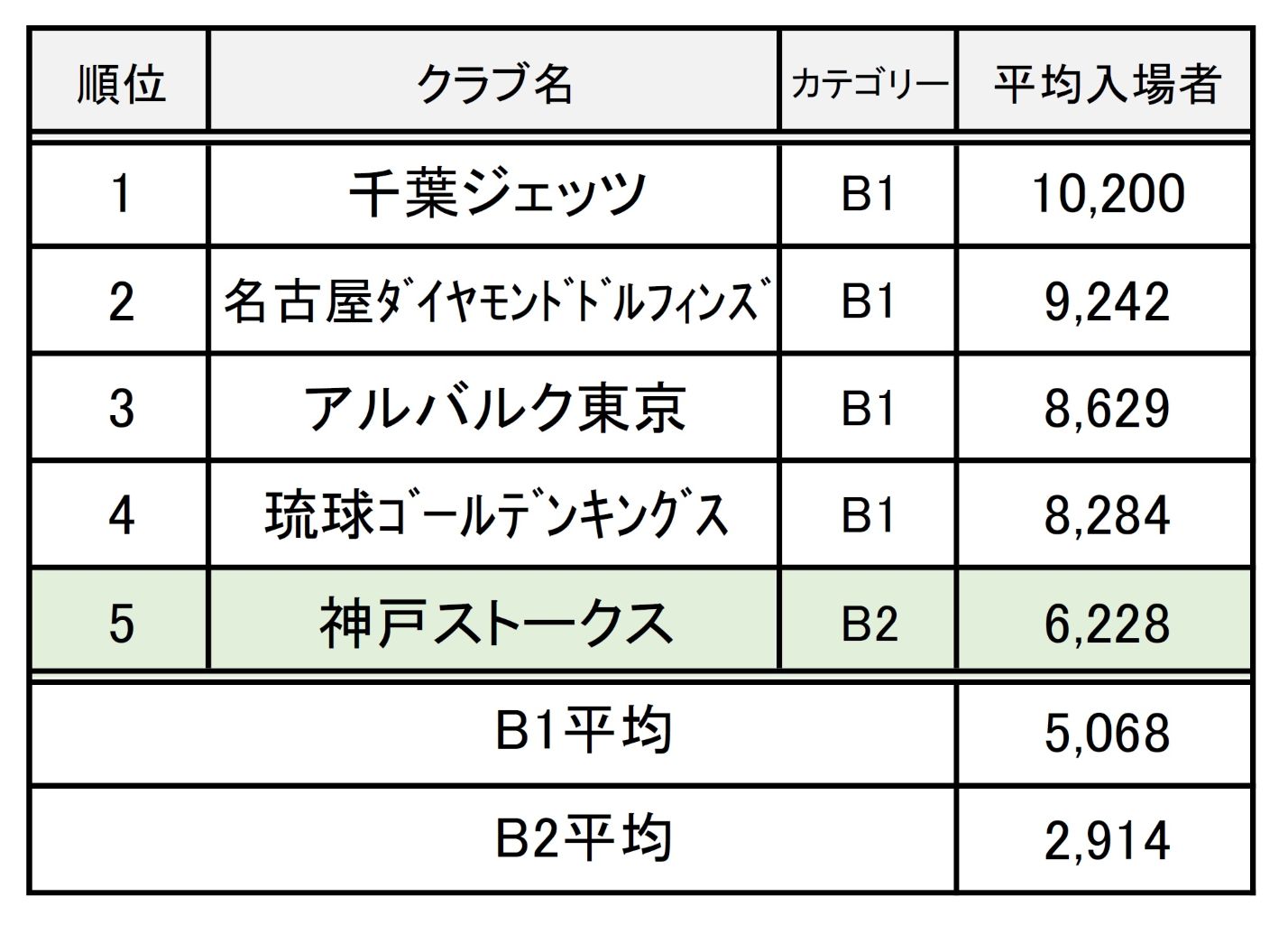 このうちB2神戸ストークスは、今シーズンから全面的にホームとしてジーライオンアリーナ神戸を使用したため、昨シーズンの平均入場者(2937人)の2倍以上となる平均6228人の入場者を集めた。