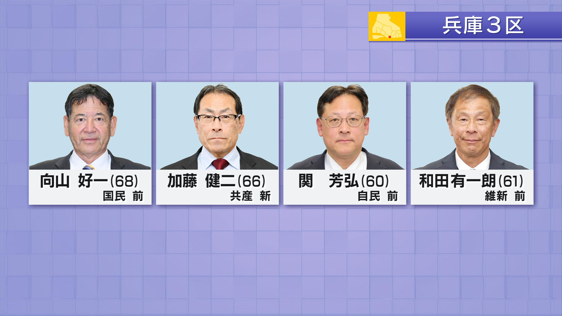 兵庫3区には届け出順に国民民主党・前職 向山好一(68)共産党・新人 加藤健二(66)自民党・前職 関芳弘(60)日本維新の会・前職 和田有一朗(61)の4人が立候補しました。