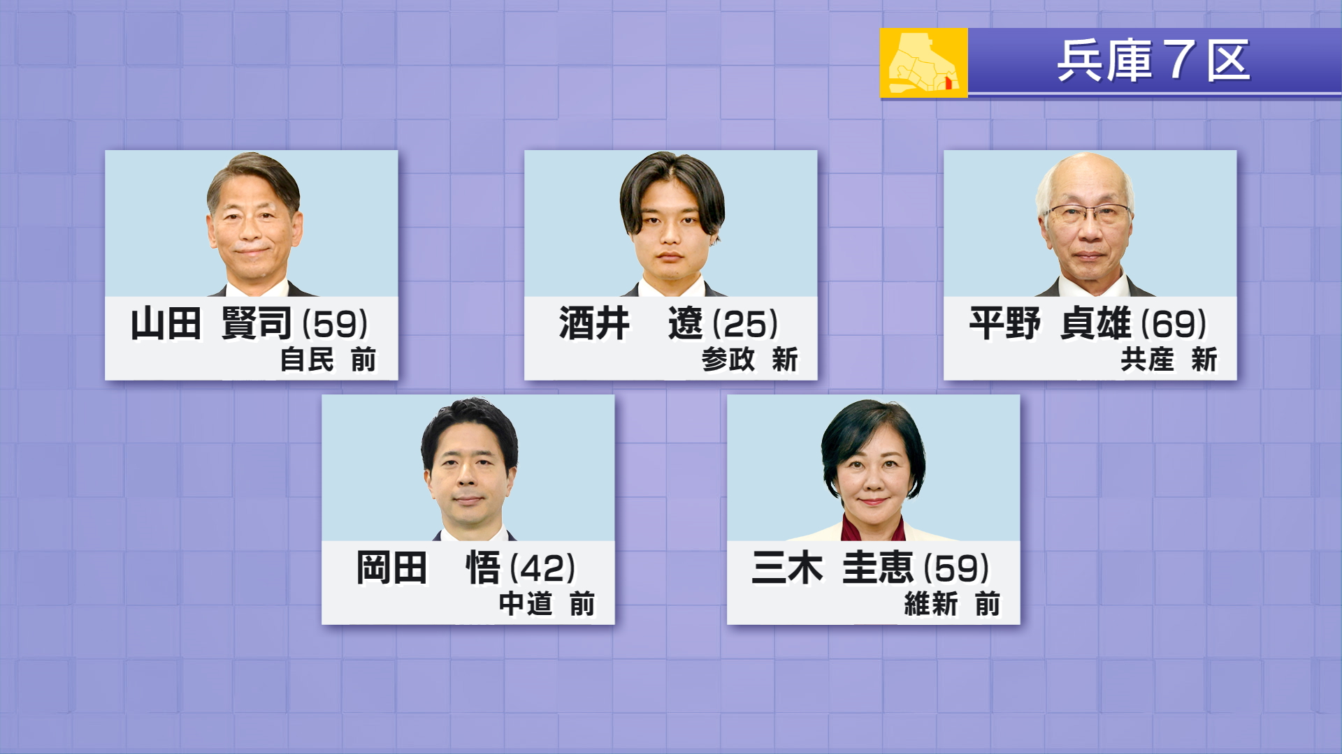 兵庫7区には届け出順に、自民党・前職 山田賢司(59)参政党・新人 酒井遼(25)共産党・新人 平野貞雄(69)中道改革連合・前職 岡田悟(42)日本維新の会・前職 三木圭恵(59)の5人が立候補しました。