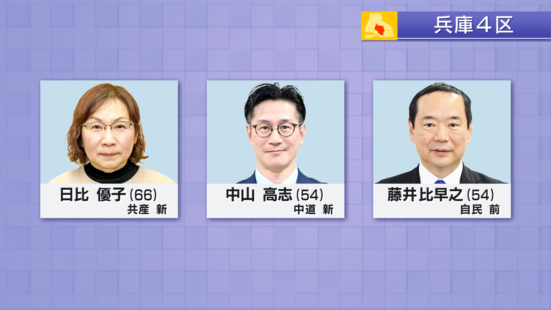 兵庫4区には届け出順に共産党・新人 日比優子(66)中道改革連合・新人 中山高志(54)自民党・前職 藤井比早之(54)の3人が立候補しました。