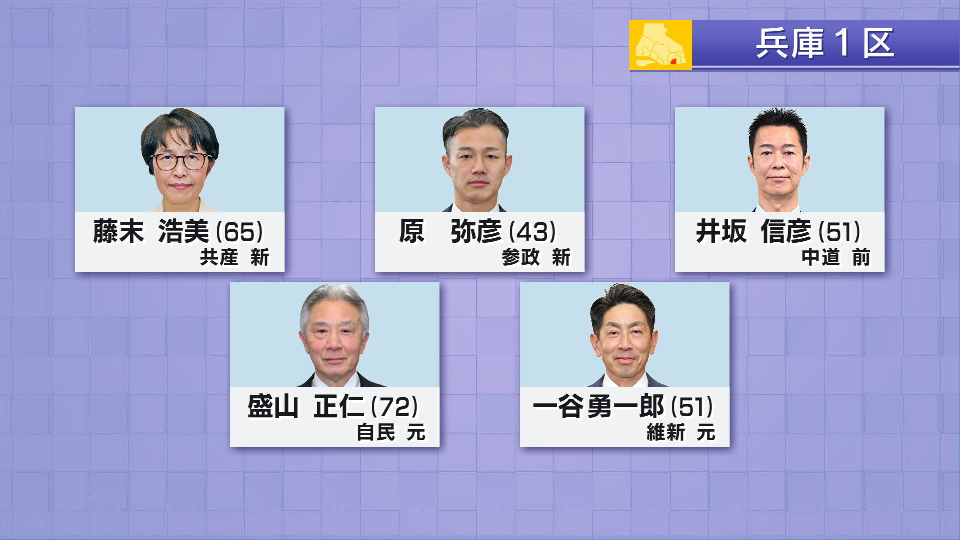 兵庫1区には届け出順に共産党・新人 藤末浩美(65)参政党・新人 原弥彦(43)中道改革連合・前職 井坂信彦(51)自民党・元職 盛山正仁(72)日本維新の会・元職 一谷勇一郎(51)の5人が立候補しました。
