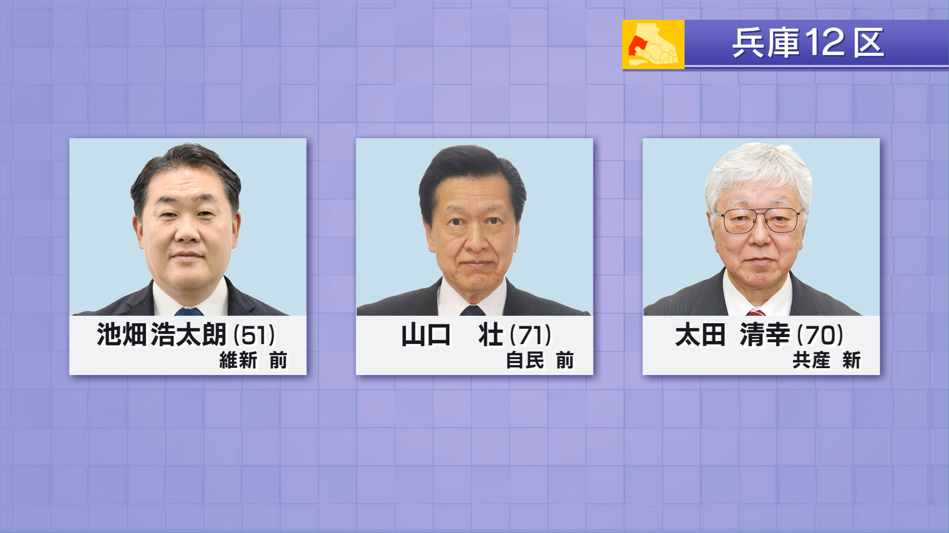 兵庫12区には届け出順に、日本維新の会・前職 池畑浩太朗(51)自民党・前職 山口壮(71)共産党・新人 太田清幸(70)の3人が立候補しました。