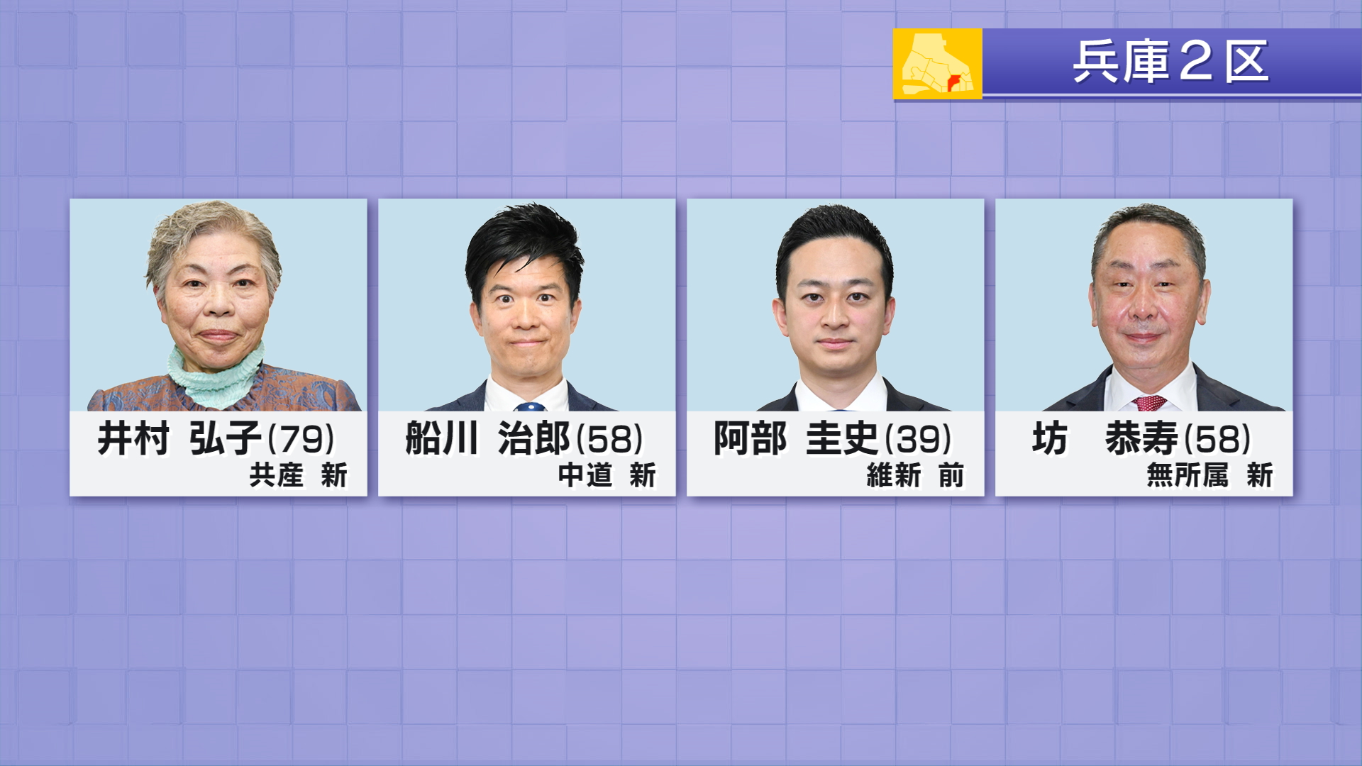 兵庫2区には届け出順に共産党・新人 井村弘子(79)中道改革連合・新人 船川治郎(58)日本維新の会・前職 阿部圭史(39)無所属・新人 坊恭寿(58)の4人が立候補しました。