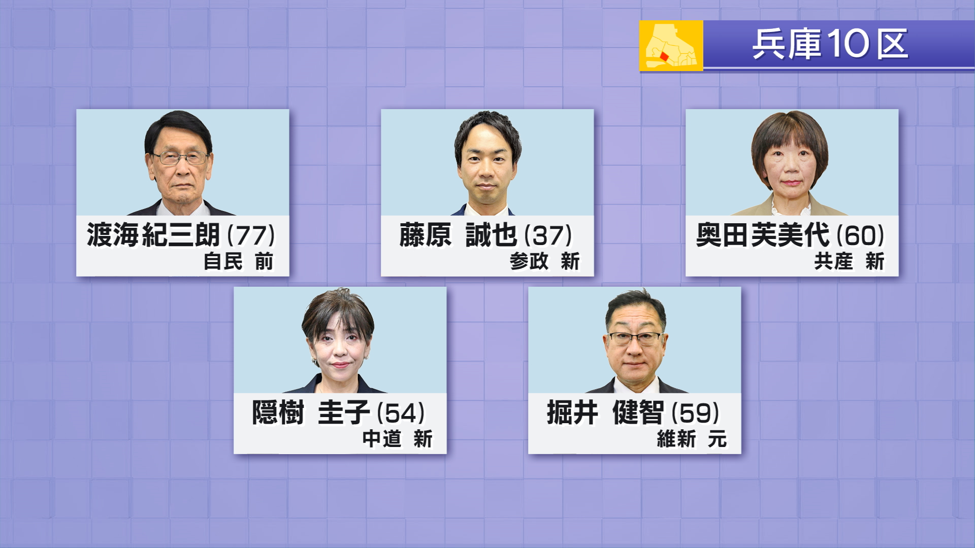 兵庫10区には届け出順に自民党・前職 渡海紀三朗(77)参政党・新人 藤原誠也(37)共産党・新人 奥田芙美代(60)中道改革連合・新人 隠樹圭子(54)日本維新の会・元職 掘井健智(59)の、5人が立候補しました。