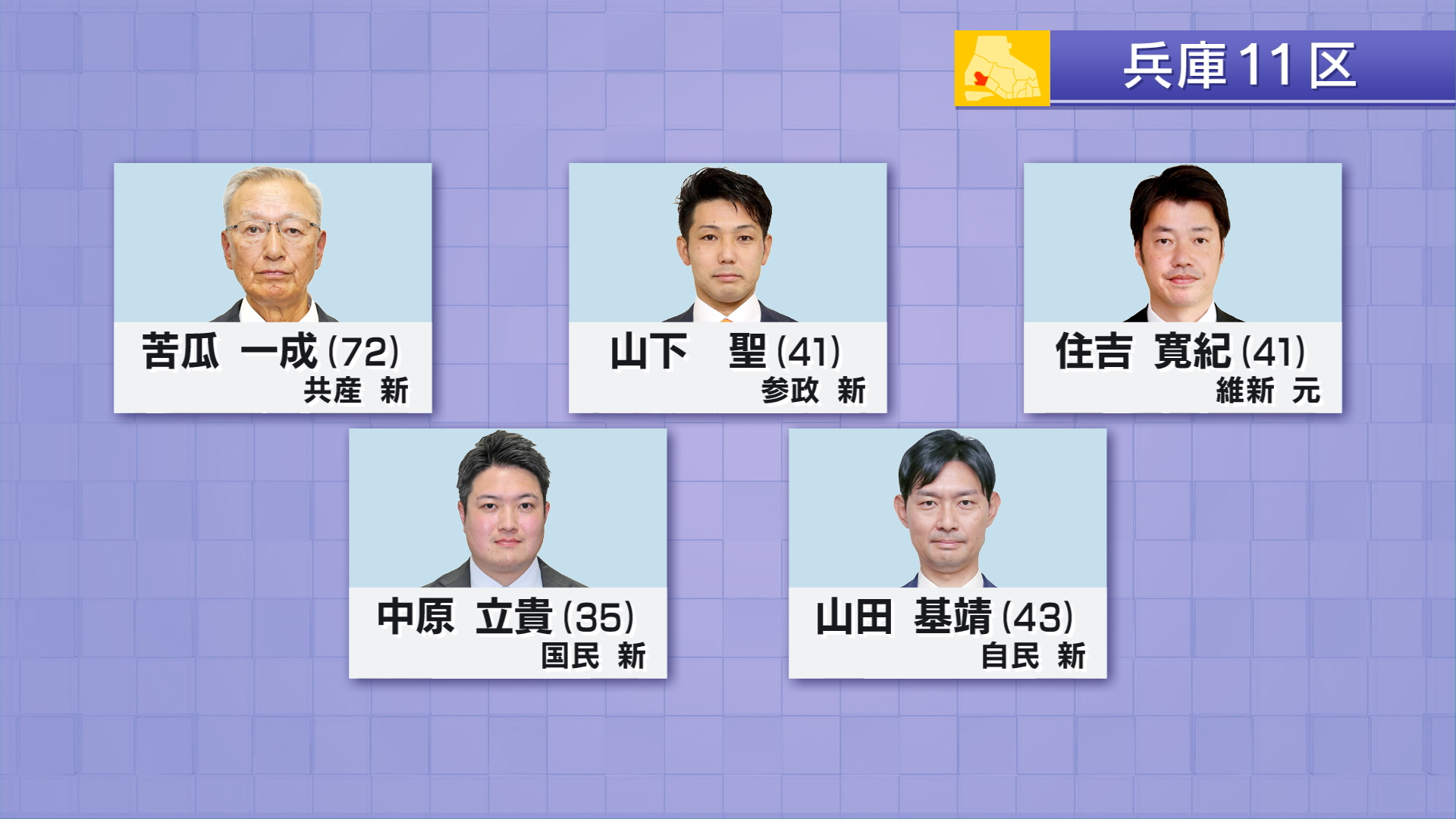 兵庫11区には届け出順に、共産党・新人 苦瓜一成(72)参政党・新人 山下聖(41)日本維新の会・元職 住吉寛紀(41)国民民主党・新人 中原立貴(35)自民党・新人 山田基靖(43)の5人が立候補しました。