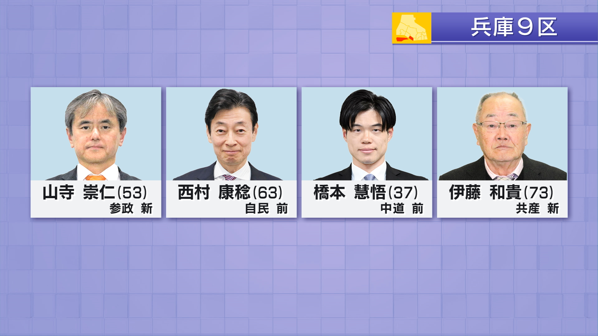兵庫9区には届け出順に参政党・新人 山寺崇仁(53)自民党・前職 西村康稔(63)中道改革連合・前職 橋本慧悟(37)共産党・新人 伊藤和貴(73)の4人が立候補しました。