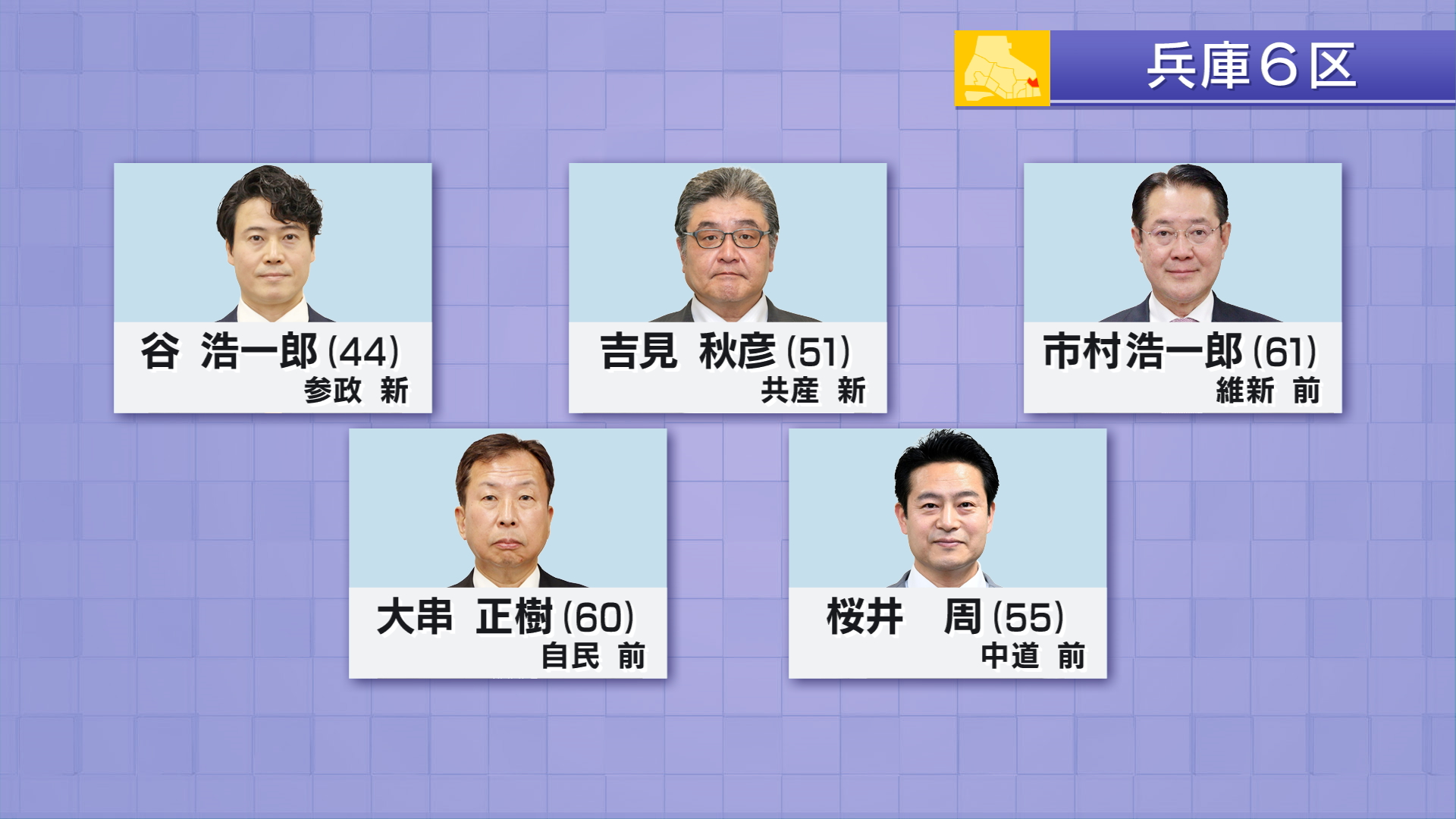 兵庫6区には届け出順に参政党・新人 谷浩一郎(44)共産党・新人 吉見秋彦(51)日本維新の会・前職 市村浩一郎(61)自民党・前職 大串正樹(60)中道改革連合・前職 桜井周(55)の、5人が立候補しました。