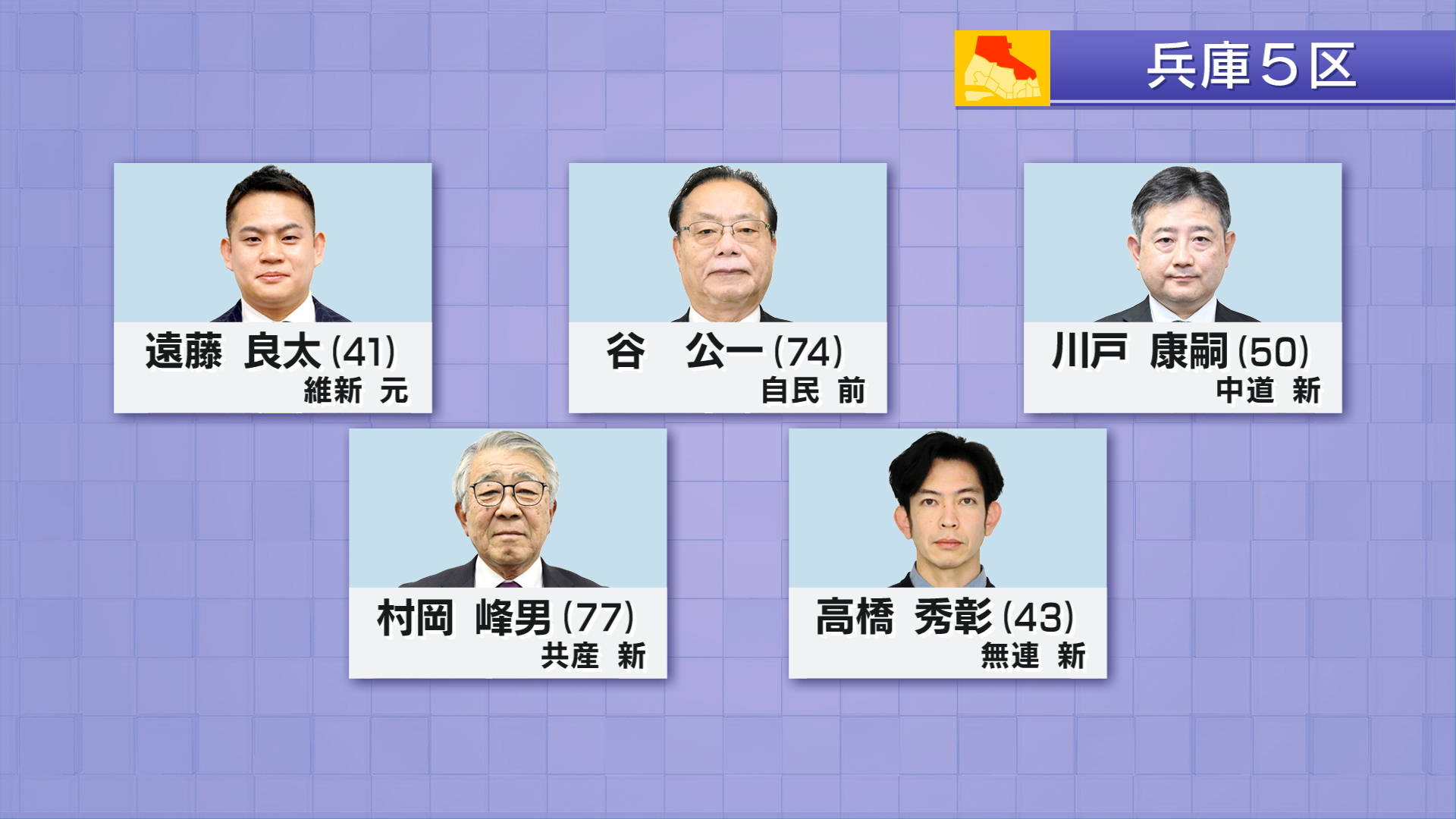 兵庫5区には届け出順に日本維新の会・元職 遠藤良太(41)自民党・前職 谷公一(74)中道改革連合・新人 川戸康嗣(50)共産党・新人 村岡峰男(77)無所属連合・新人 高橋秀彰(43)の5人が立候補しました。