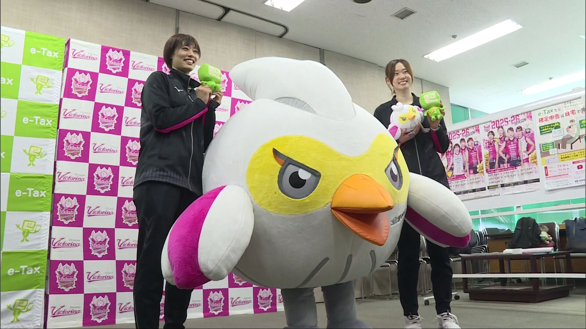 確定申告の時期を前に、姫路市に拠点を置くバレーボール女子Vリーグ「ヴィクトリーナ姫路」の選手が電子申告システム「e-Tax」の活用をPRしました。