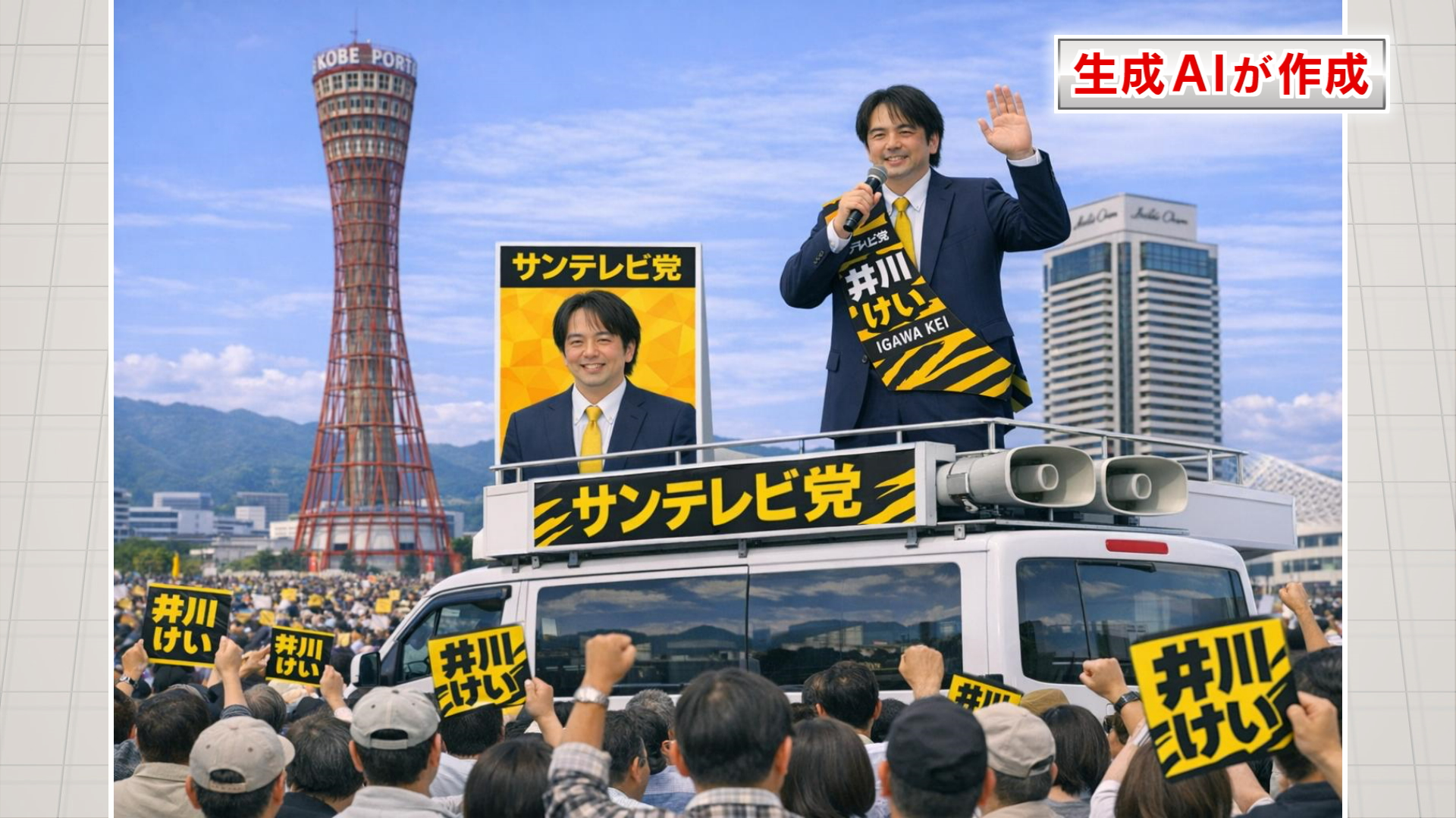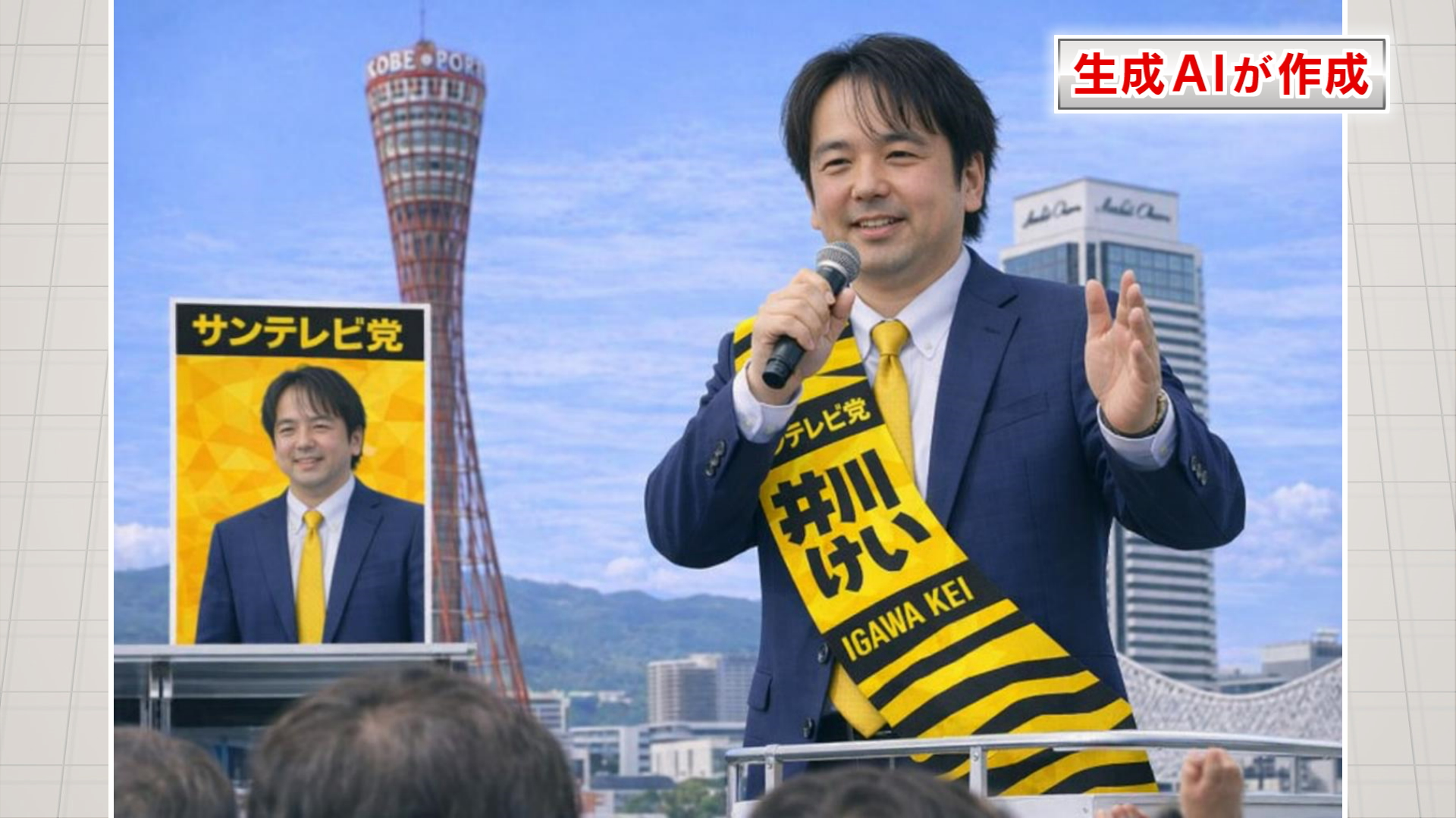 サンテレビの番組NEWS×情報キャッチプラスのコメンテーターで元阪神タイガース投手の井川慶さんが神戸で選挙演説をしている画像をAIに作成してもらいました。