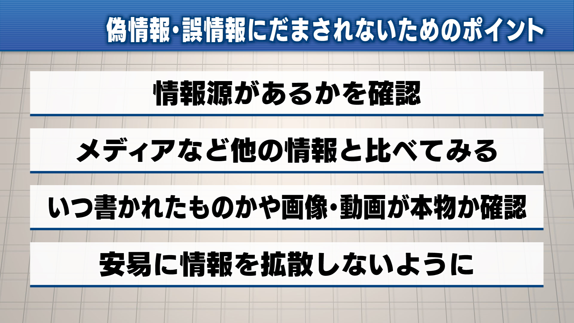 情報源があるかを確認し、メディアなど他の情報と比べてみること、その情報がいつ書かれたものかや画像・動画が本物かどうかを確かめること、安易に情報を拡散しないようにしましょう。