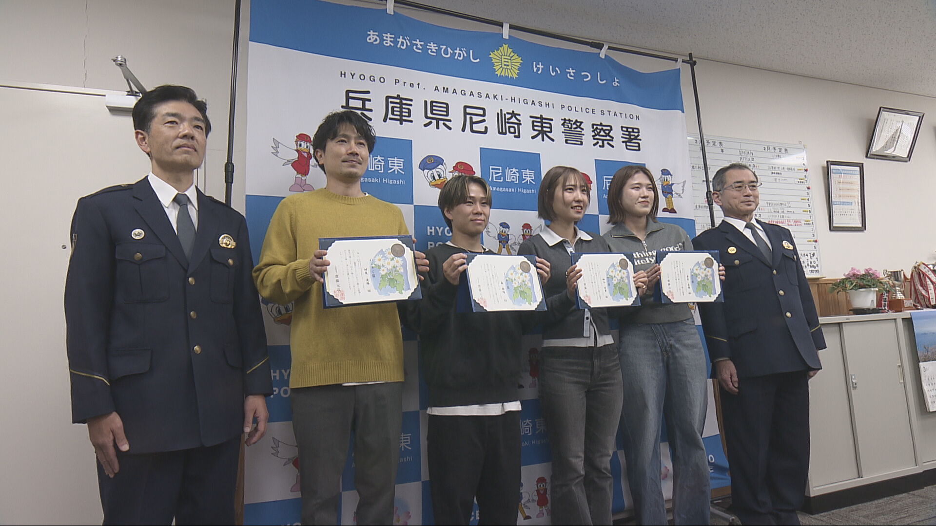 JR尼崎駅前の歩道橋から飛び降りようとしていた女性を救ったとして、西宮市などに住む男女4人に、兵庫県から「のじぎく賞」が贈られました。