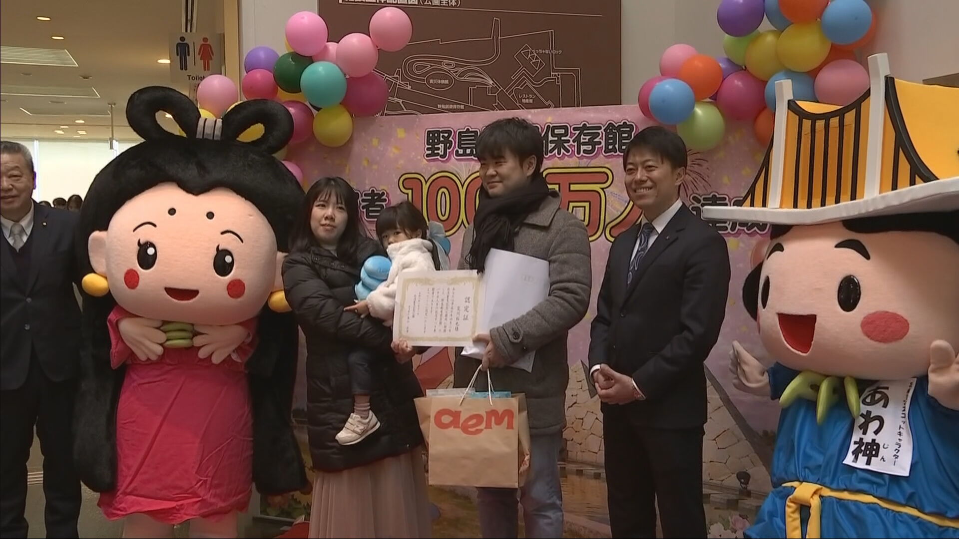1998年4月のオープンから約28年の2月11日、保存館の来館者が1000万人を突破し、観光で訪れた大阪府箕面市の荒川裕也さん、綾香さん、茉璃ちゃんの家族に記念品が贈られました。