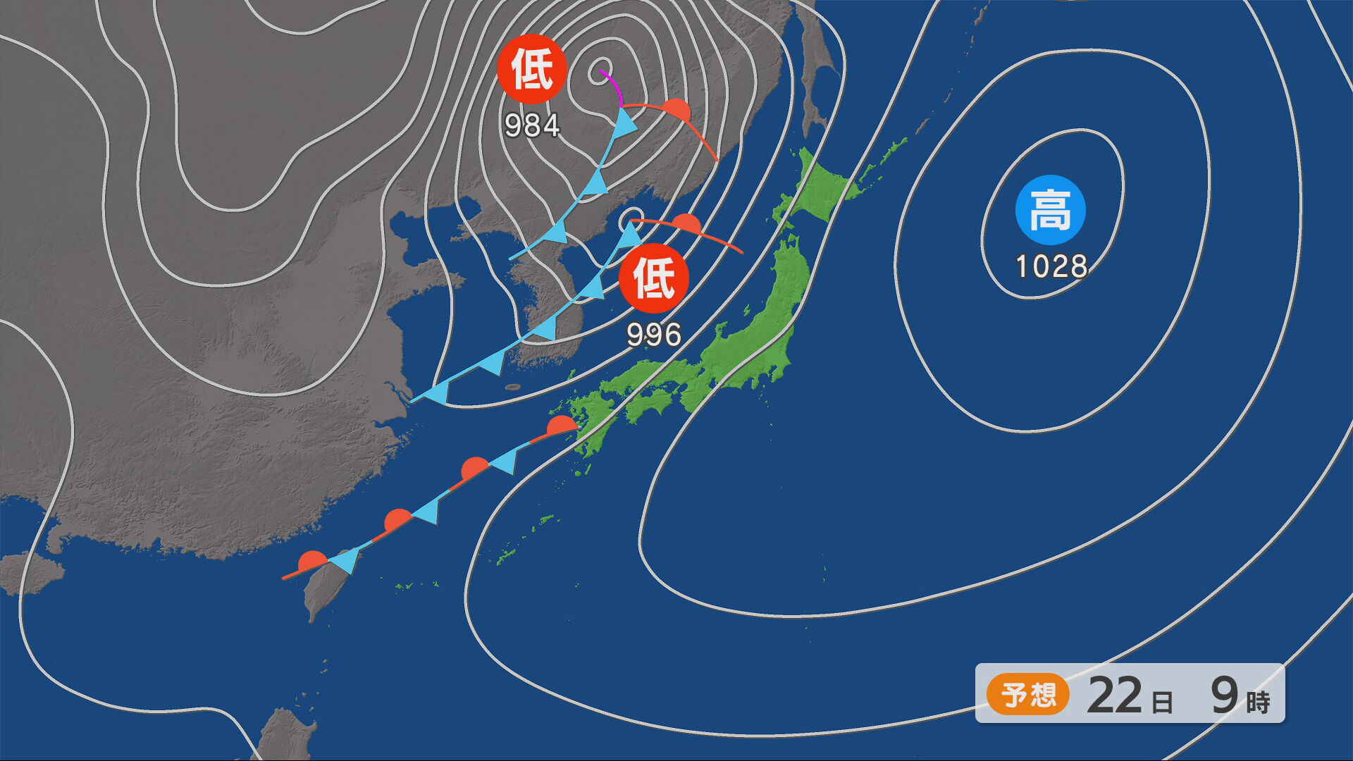 22日から23日午前中にかけて、日本海を前線を伴った低気圧が北東に進み、低気圧からのびる前線が西日本を通過する見込みです。この前線に向かって暖かく湿った空気が流れ込むため、兵庫県では、22日夜のはじめ頃から23日午前中にかけて、大気の状態が非常に不安定となり、局地的に雷雲が発達するでしょう。