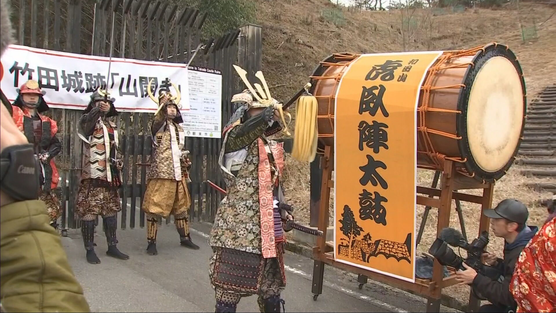 国指定の史跡・竹田城跡に続く門の前では、今シーズンの山開きを知らせるイベントが行われ、武将に扮した朝来市の藤岡勇市長が開山を宣言しました。