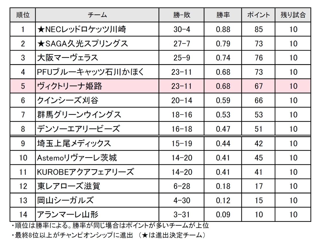 SVリーグ女子はレギュラーシーズンが残り10試合となり、首位・NEC川崎と、2位・SAGA久光がプレーオフ(チャンピオンシップ)への進出を決めている。