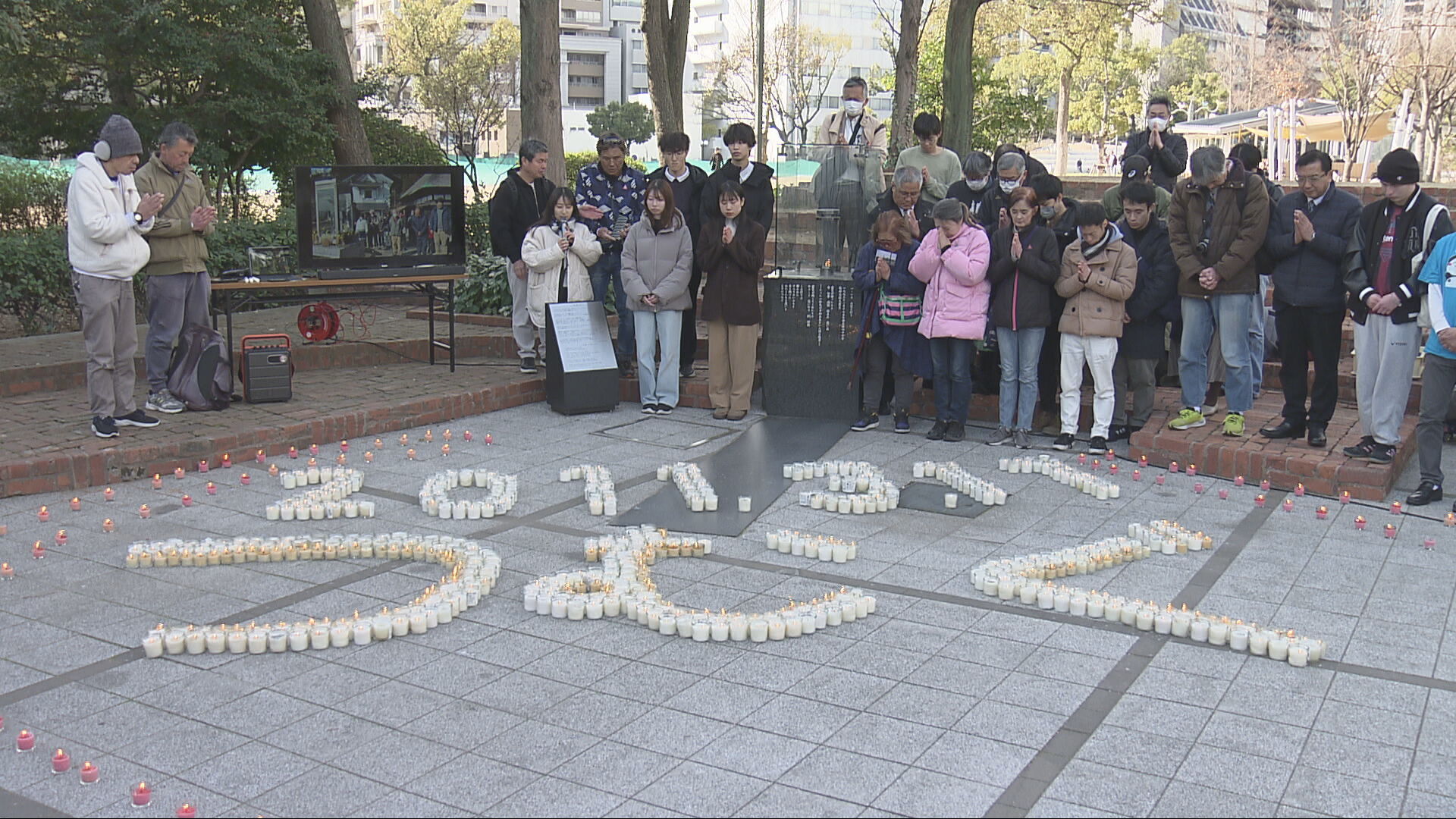 また、東遊園地から分灯された希望の灯りがある岩手県陸前高田市とオンラインでつなぎ、地震発生時刻の午後2時46分に合わせて黙とうを捧げました。