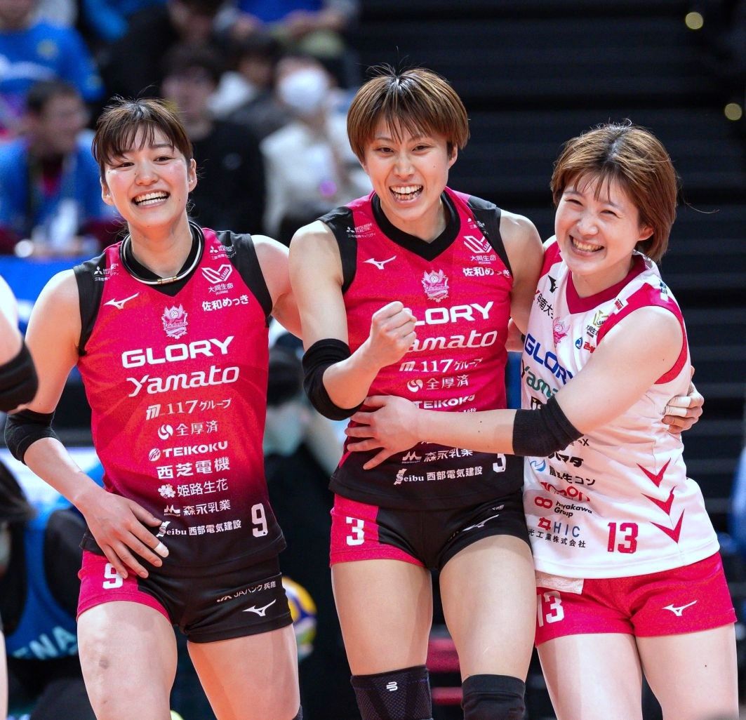 長いラリーを制した ヴィクトリーナ姫路 3 田中咲希(中央)とスーパーレシーブを連発した (左)9 渡邉かや 、(右)13 福留慧美 /(C)SV.LEAGUE
