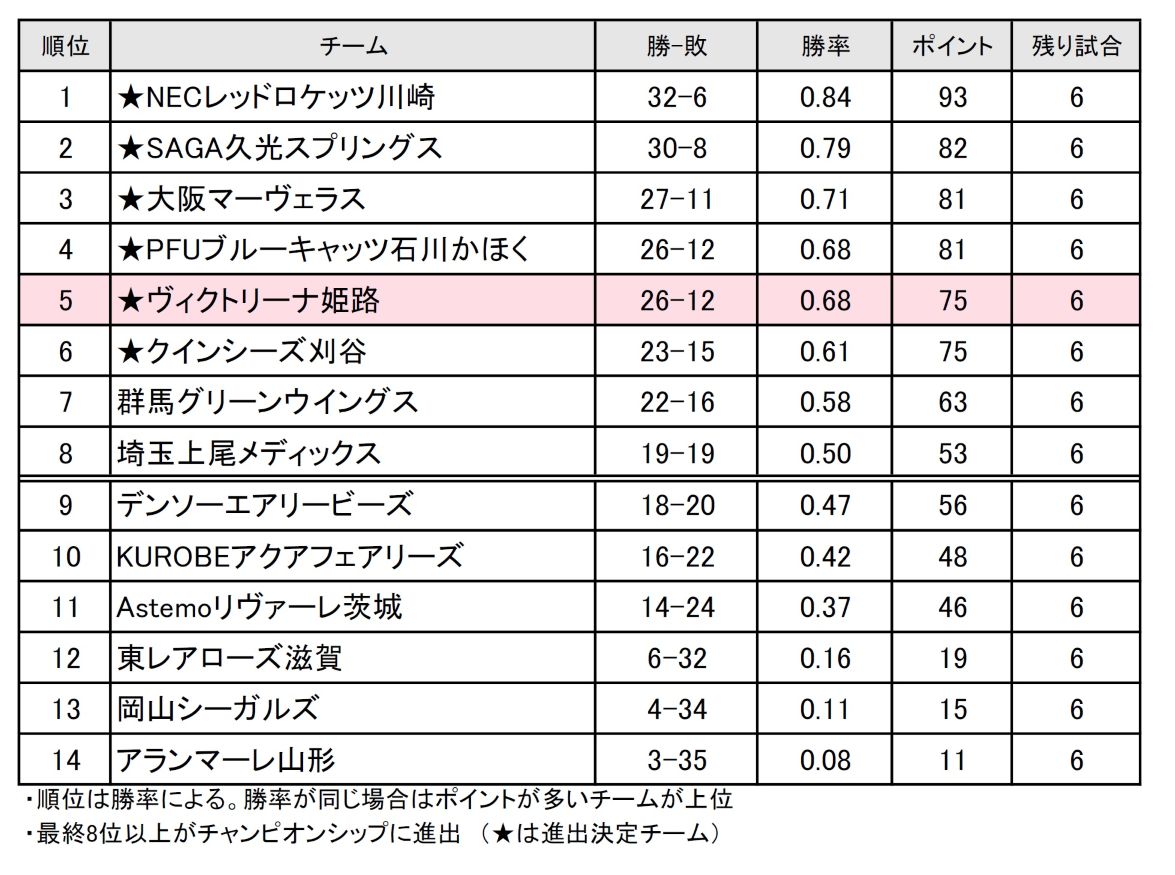 SAGA久光と星を分けたヴィクトリーナに対し、ポイントで上回るPFUがデンソーに2連勝して4位に浮上。