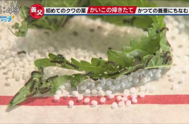 カイコの幼虫に初めてクワの葉を与える「掃きたて」 養父市大屋町