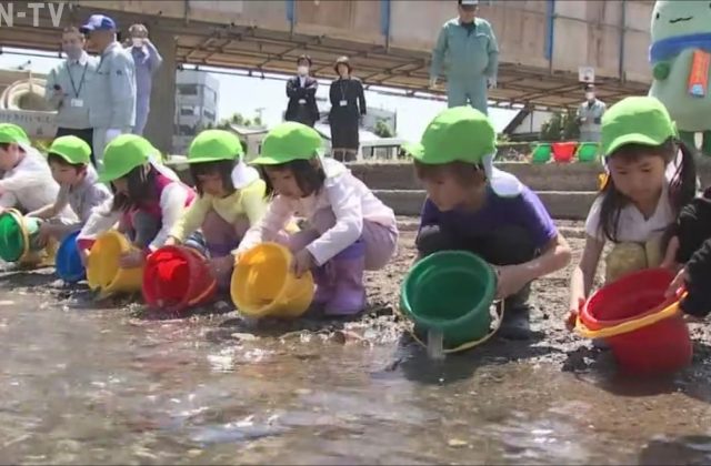 養父市で園児が稚アユ放流 6月1日のアユ漁解禁を前に