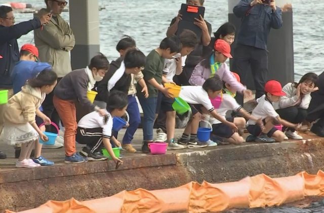 稚魚の放流で豊かな海を学ぶ 淡路市の仮屋漁港で小学生が参加