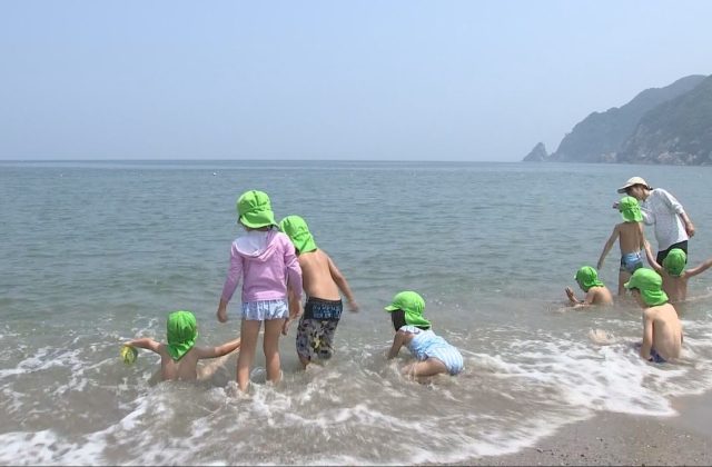 新温泉町の海水浴場で海開き 園児らが水遊び楽しむ