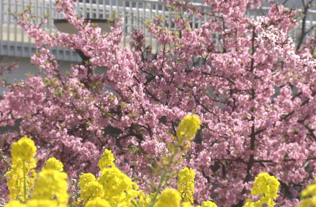 河津桜と菜の花のコントラストが神戸市灘区の西郷川河口公園で楽しめる
